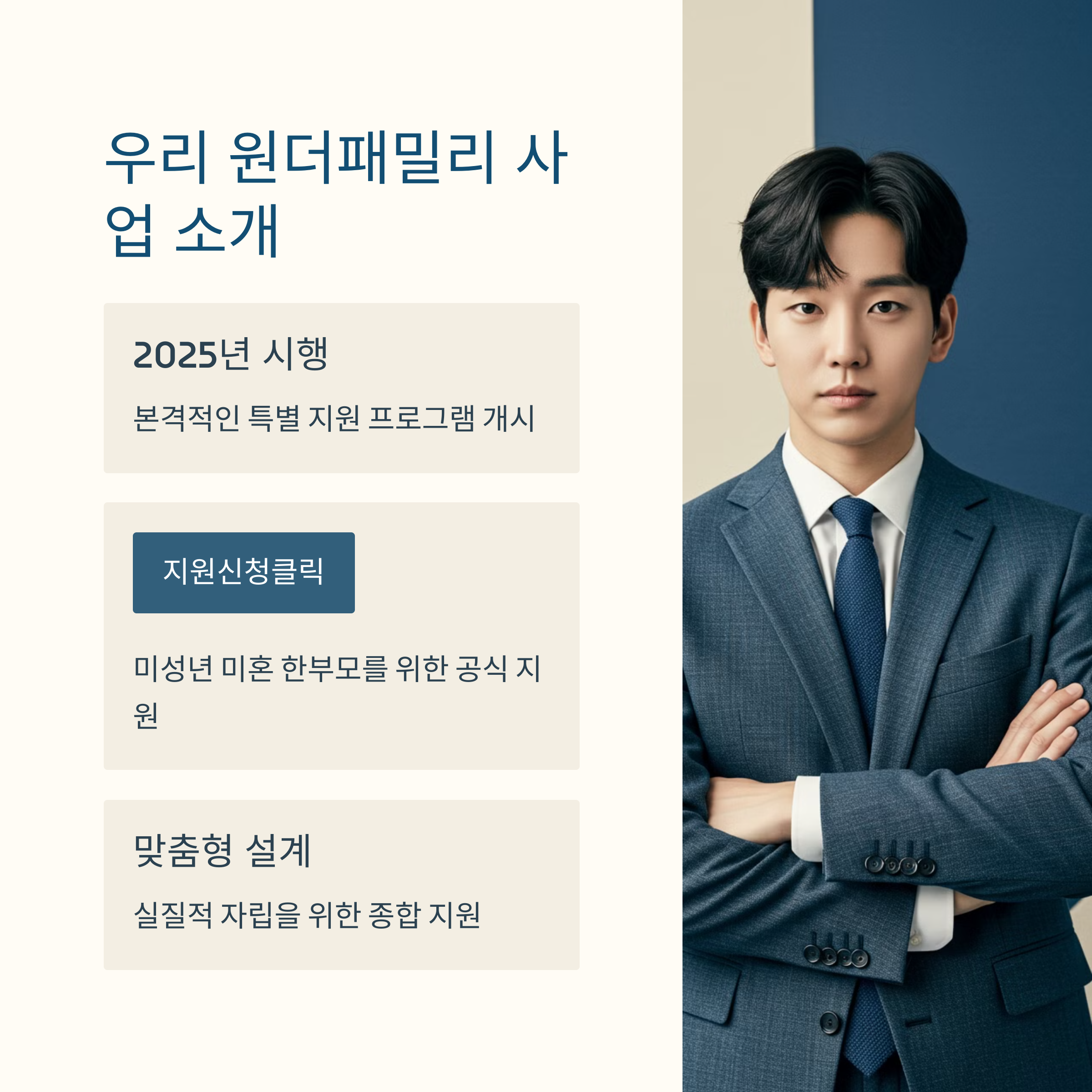 ‘우리 원더패밀리’는 보건복지부에서 2025년부터 본격 확대 시행하는 미성년 미혼 한부모 가정 대상 특별 지원사업입니다.