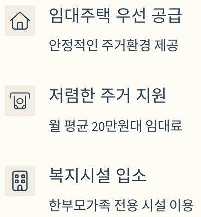 → 보건복지부 또는 LH와 연계한 한부모 전용 임대주택 지원이 가능합니다.