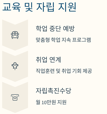 | 교육 지원 | 검정고시, 직업훈련, 진로 컨설팅 프로그램 연계 |
