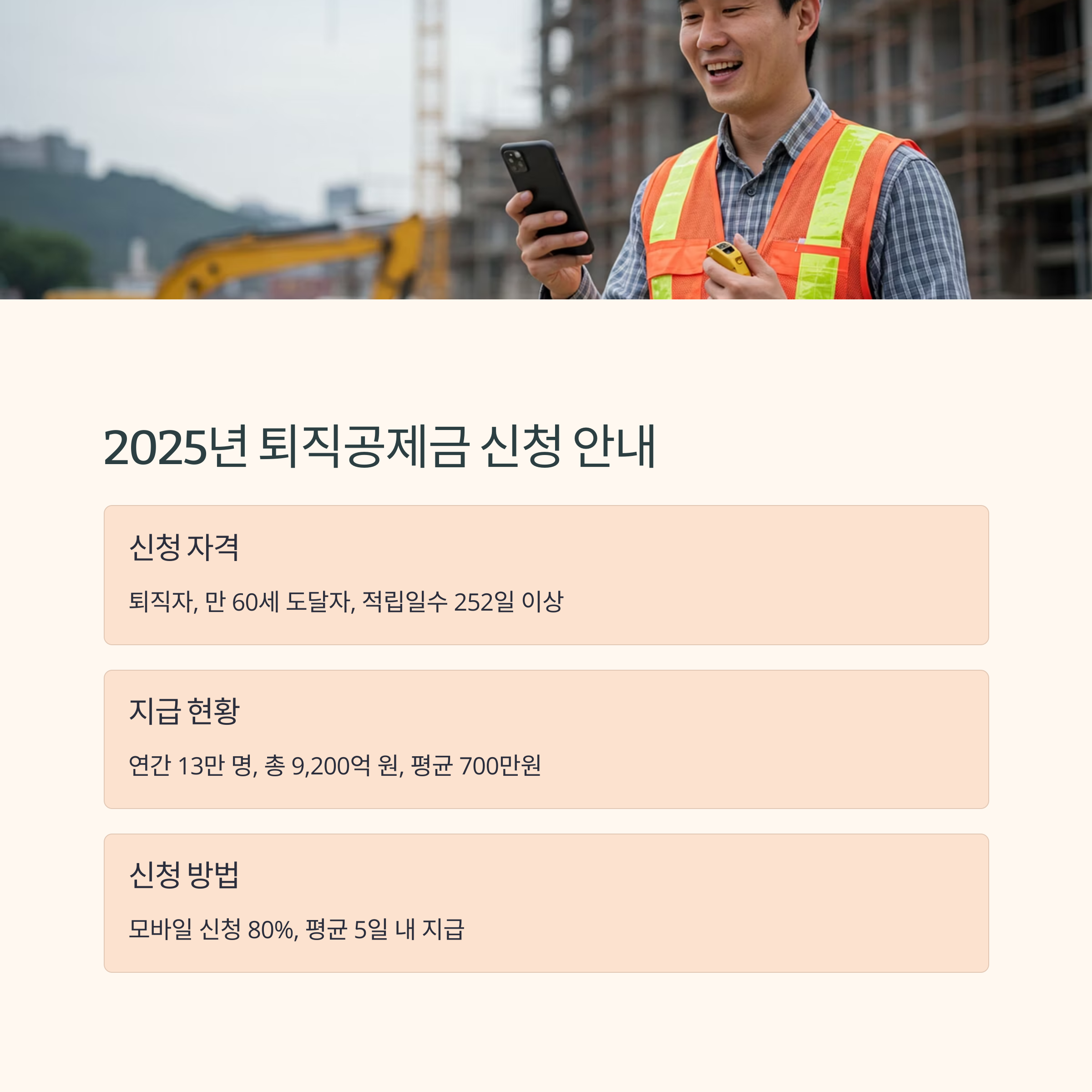 건설근로자 퇴직공제제도는 건설현장을 이동하며 일하는 건설근로자의 퇴직 후 생활안정을 지원하기 위한 핵심 제도입니다. 2025년 기준으로 퇴직공제금 신청 자격과 방법을 알아보겠습니다.
