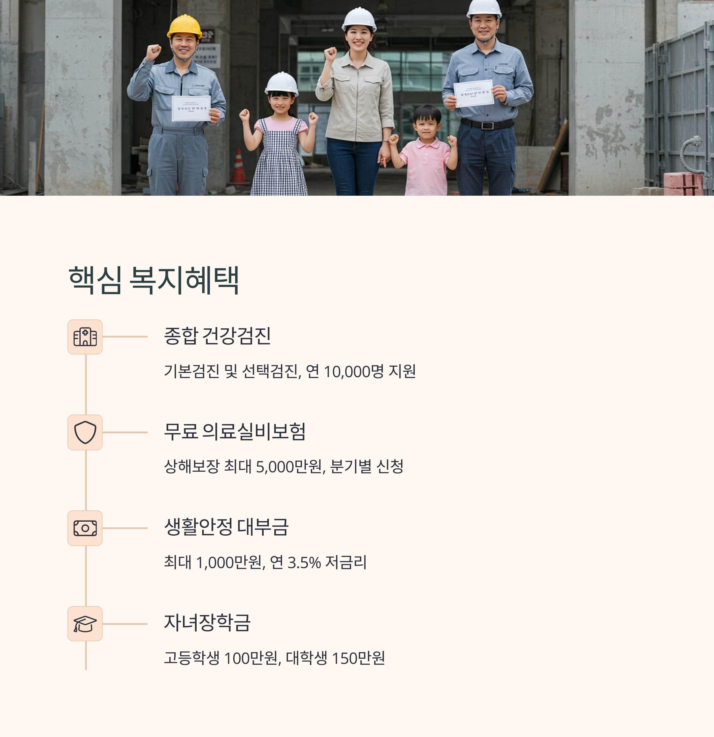 건설근로자공제회는 퇴직공제금 외에도 다양한 복지서비스를 제공합니다. 2025년 기준 주요 복지혜택을 정리했습니다.