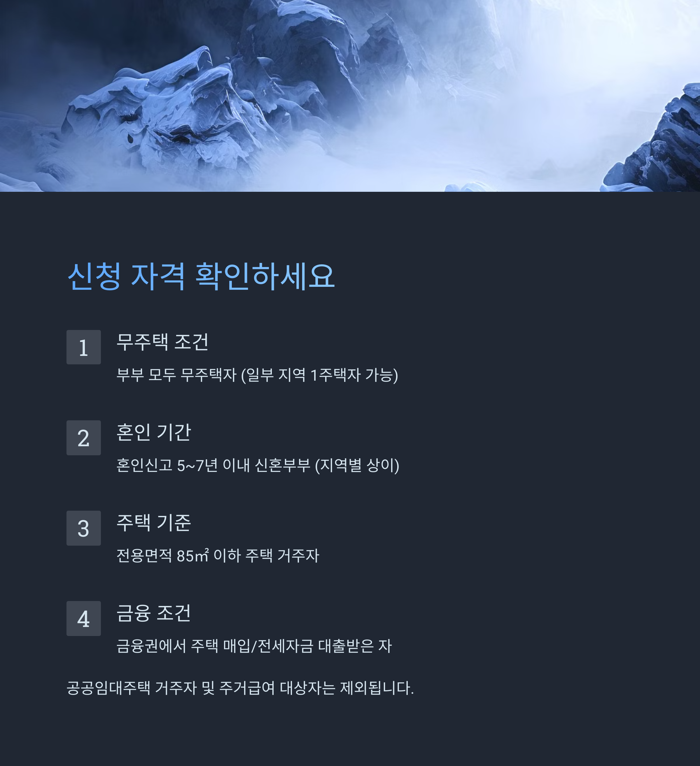 - 무주택 요건: 세대 구성원 전원이 무주택인 경우 (일부 정책은 주택 매입 자금 대출 이자 지원 포함)