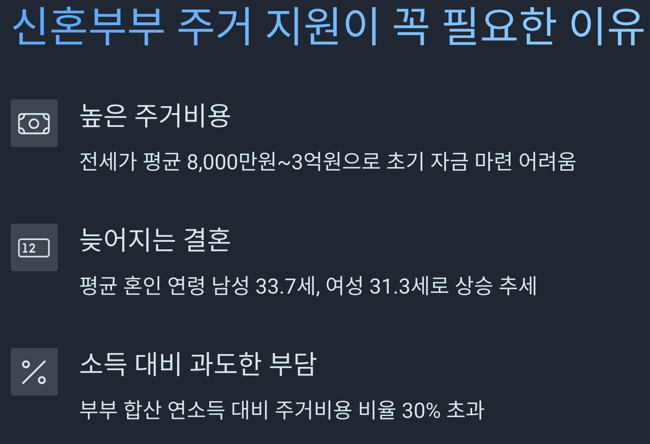 신혼부부는 사회 초년생이거나 경제적으로 아직 기반이 불안정한 경우가 많습니다. 결혼이라는 새로운 시작 앞에서 주택 구매는 물론, 전세 보증금 마련조차 쉽지 않은 현실입니다. 높은 금리까지 더해지면 주거 비용은 더욱 큰 부담으로 느껴질 수밖에 없습니다.