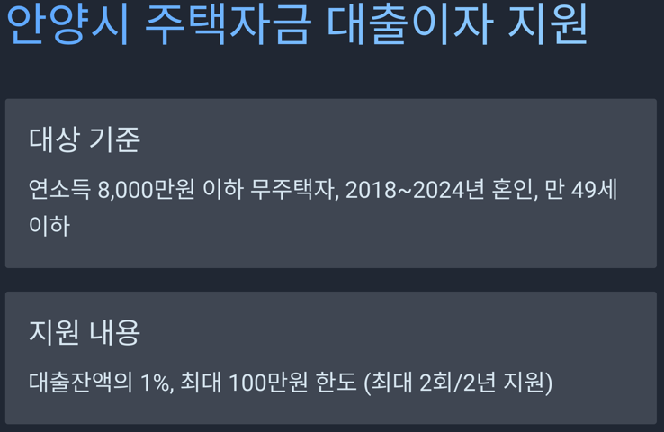 안양시에서는 2025 경기도 신혼부부 전세자금 대출이자 지원뿐만 아니라 주택 매입 자금 대출 이자까지 지원하는 사업을 시행합니다.