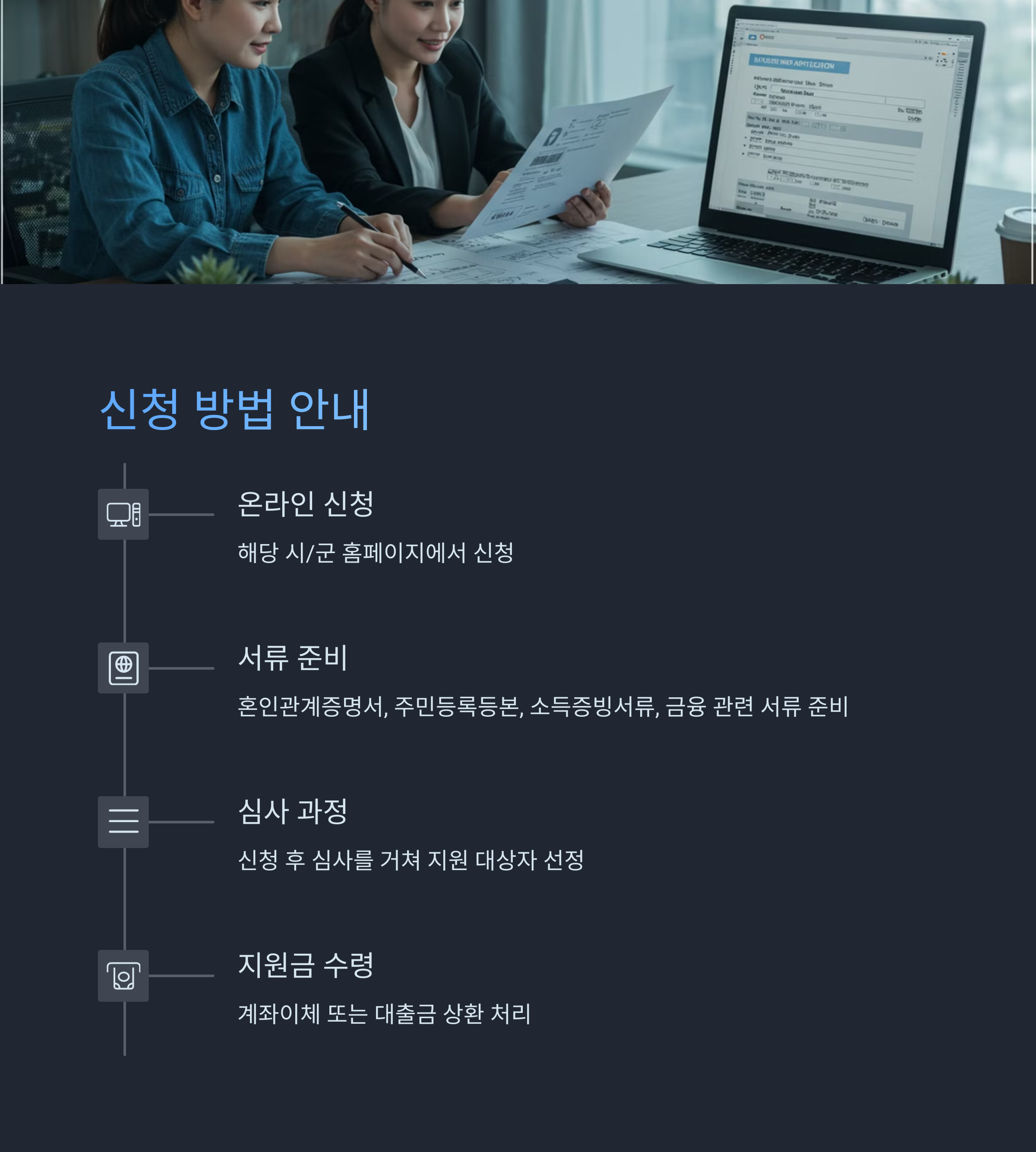 2025 경기도 신혼부부 전세자금 대출 및 이자 지원 신청 절차 또한 각 시군별로 차이가 있을 수 있습니다. 하지만 일반적으로 다음과 같은 단계를 거치는 경우가 많습니다.