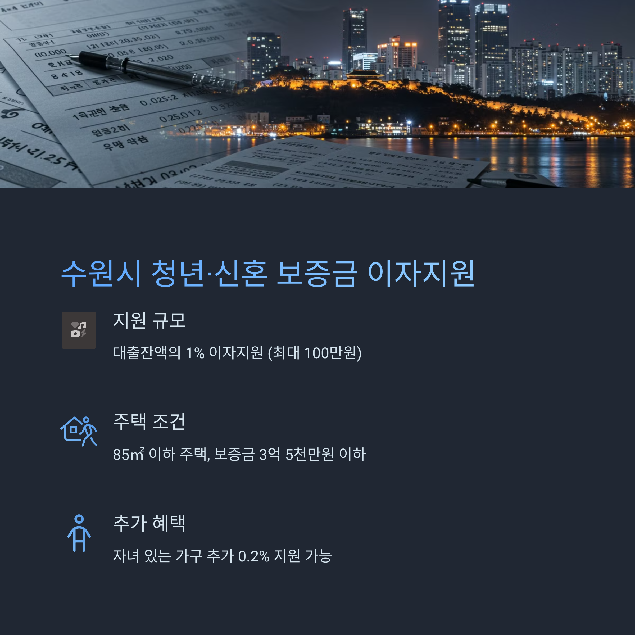 - 지원 대상: 주택은 수원시 소재, 전용면적 60㎡ 이하, 보증금(전세 전환가액) 1억 5천만 원 이하
