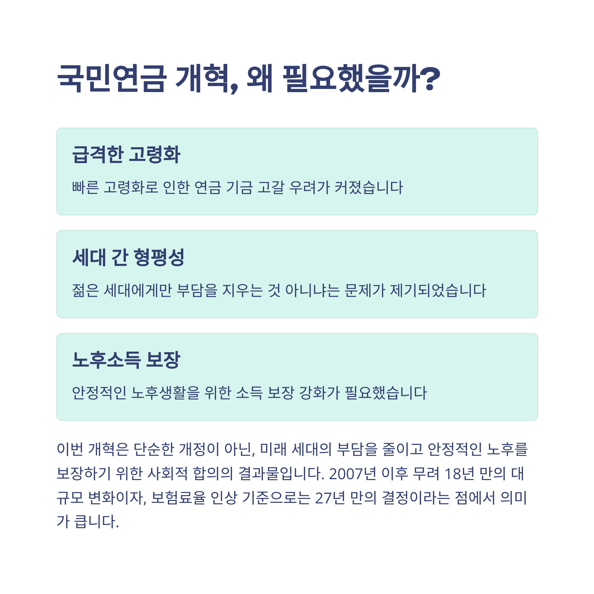 - 이번 국민연금 개혁이 필요했던 가장 큰 배경은 바로 급격한 고령화와 그에 따른 재정 고갈 우려였습니다.