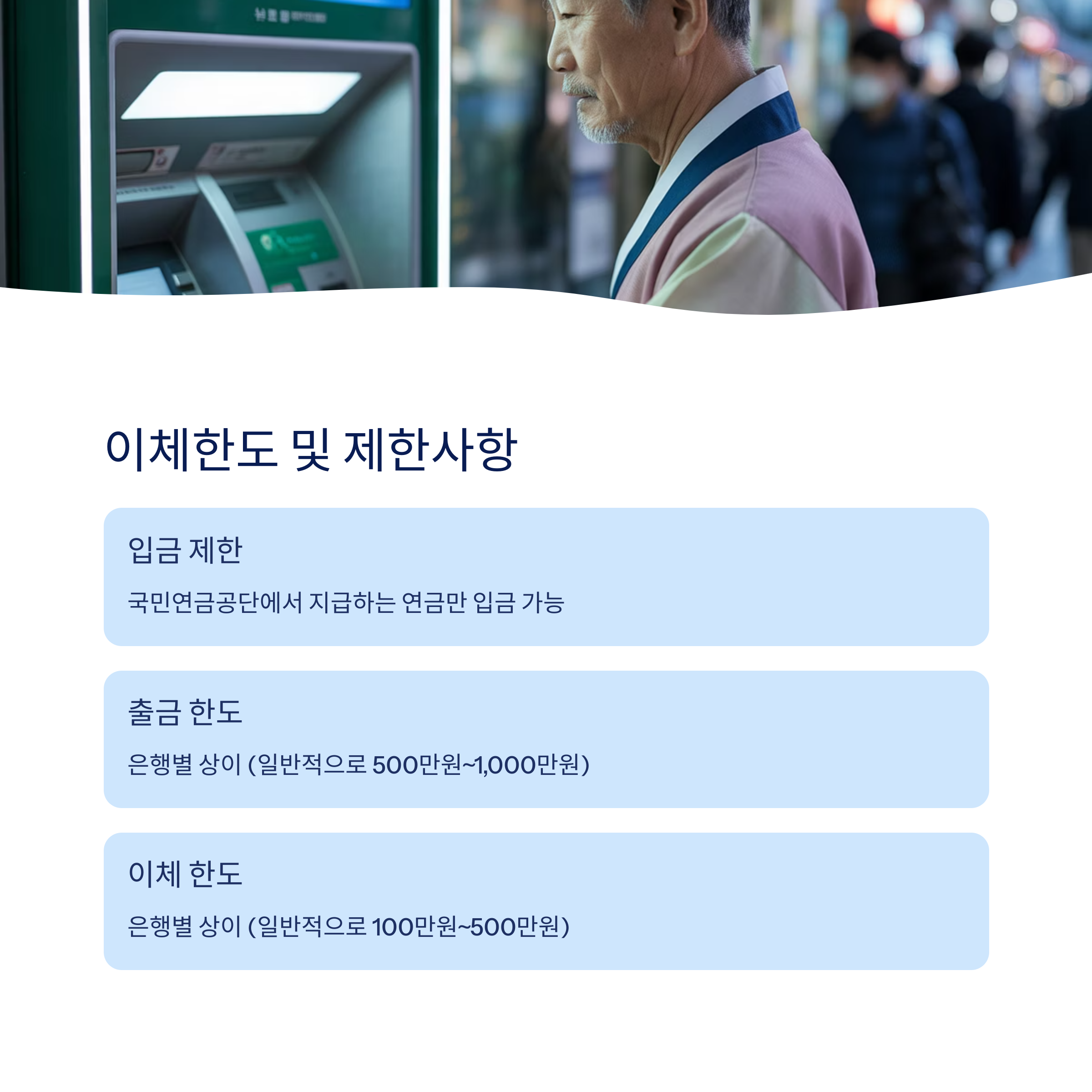 국민연금 안심통장은 연금 수급자를 위한 특별한 통장이지만, 일반 통장과 마찬가지로 이체한도와 제한사항이 있습니다. 이러한 제한은 연금 수급자의 안전한 자금 관리를 위한 것이니, 미리 알아두시면 편리하게 이용하실 수 있을 거예요.