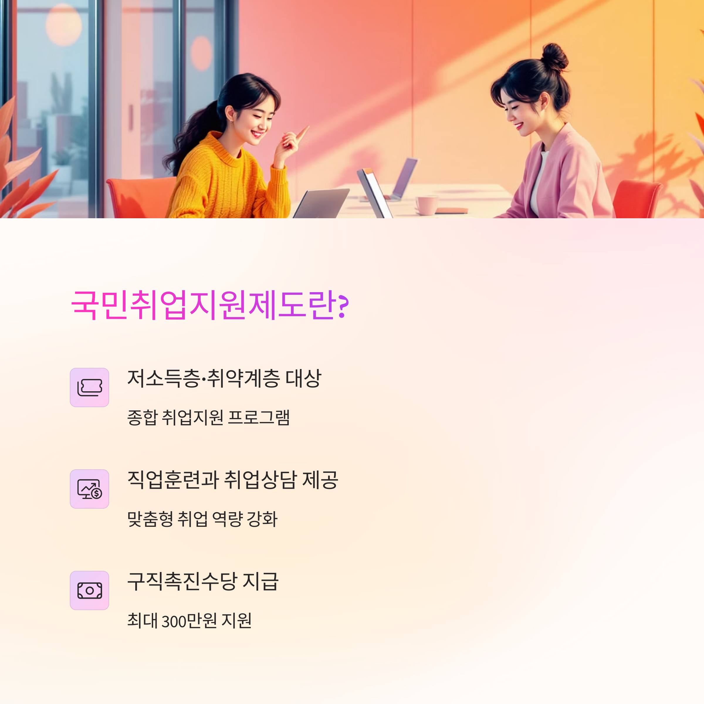 - 고용보험 미가입자거나 청년, 경력단절 여성이라면 국민취업지원제도 활용