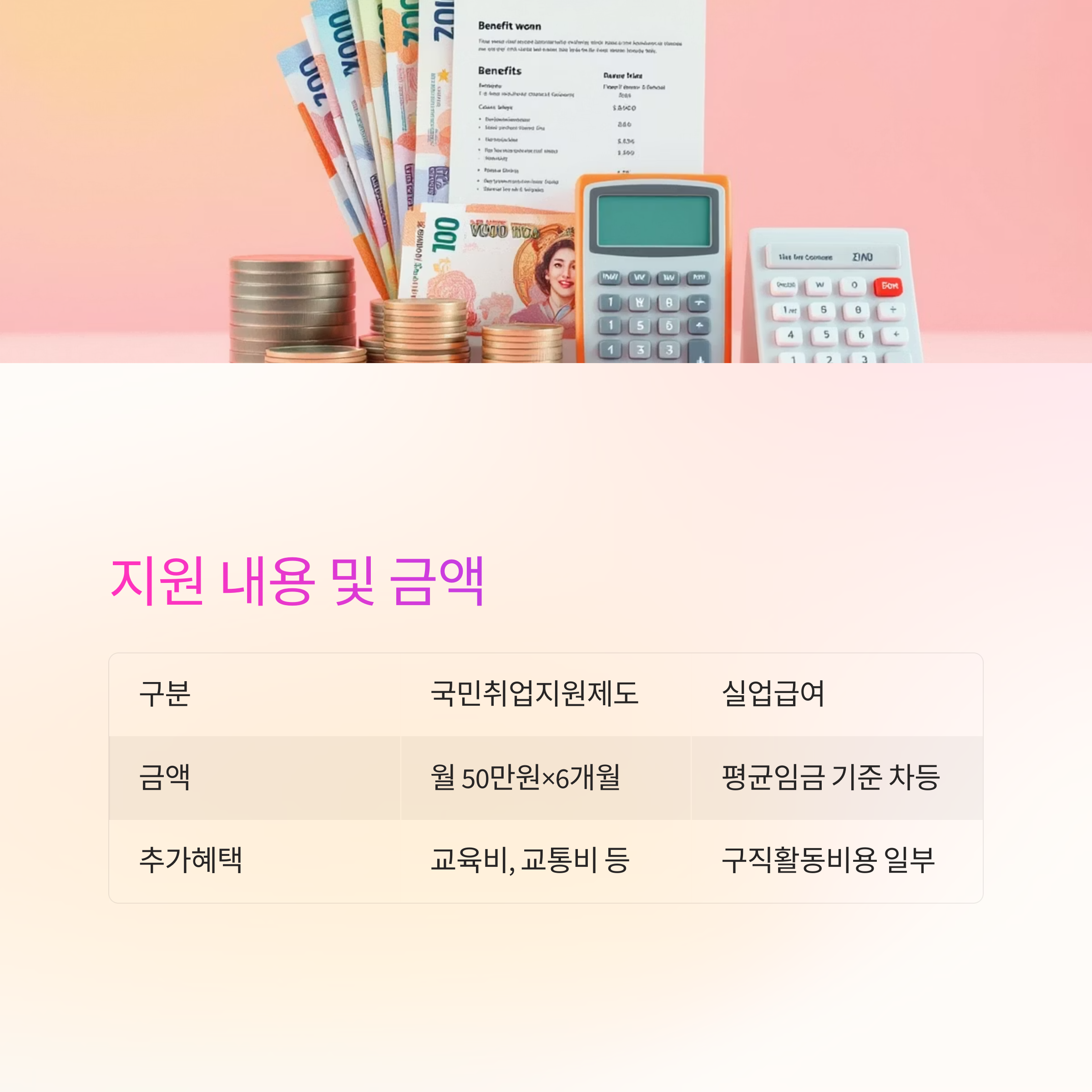지원받는 금액과 그 방식도 두 제도는 꽤나 다릅니다. 실업급여는 과거 급여 수준에 비례해 지급되며, 국민취업지원제도는 일정 정액을 지급하는 방식이죠.