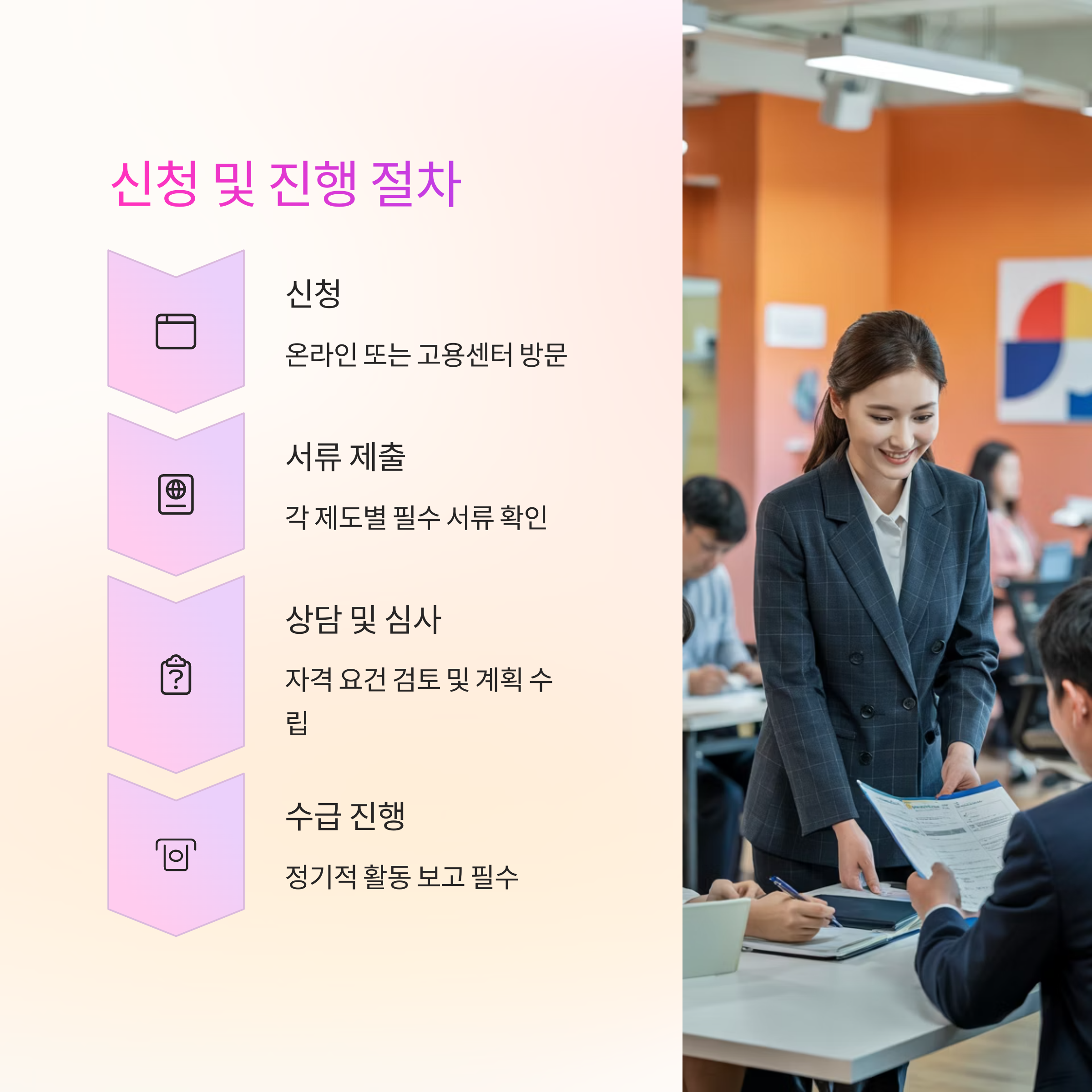 - 국민취업지원제도: 자격 심사 → 참여 신청 → 취업활동계획 수립 → 구직활동 지원