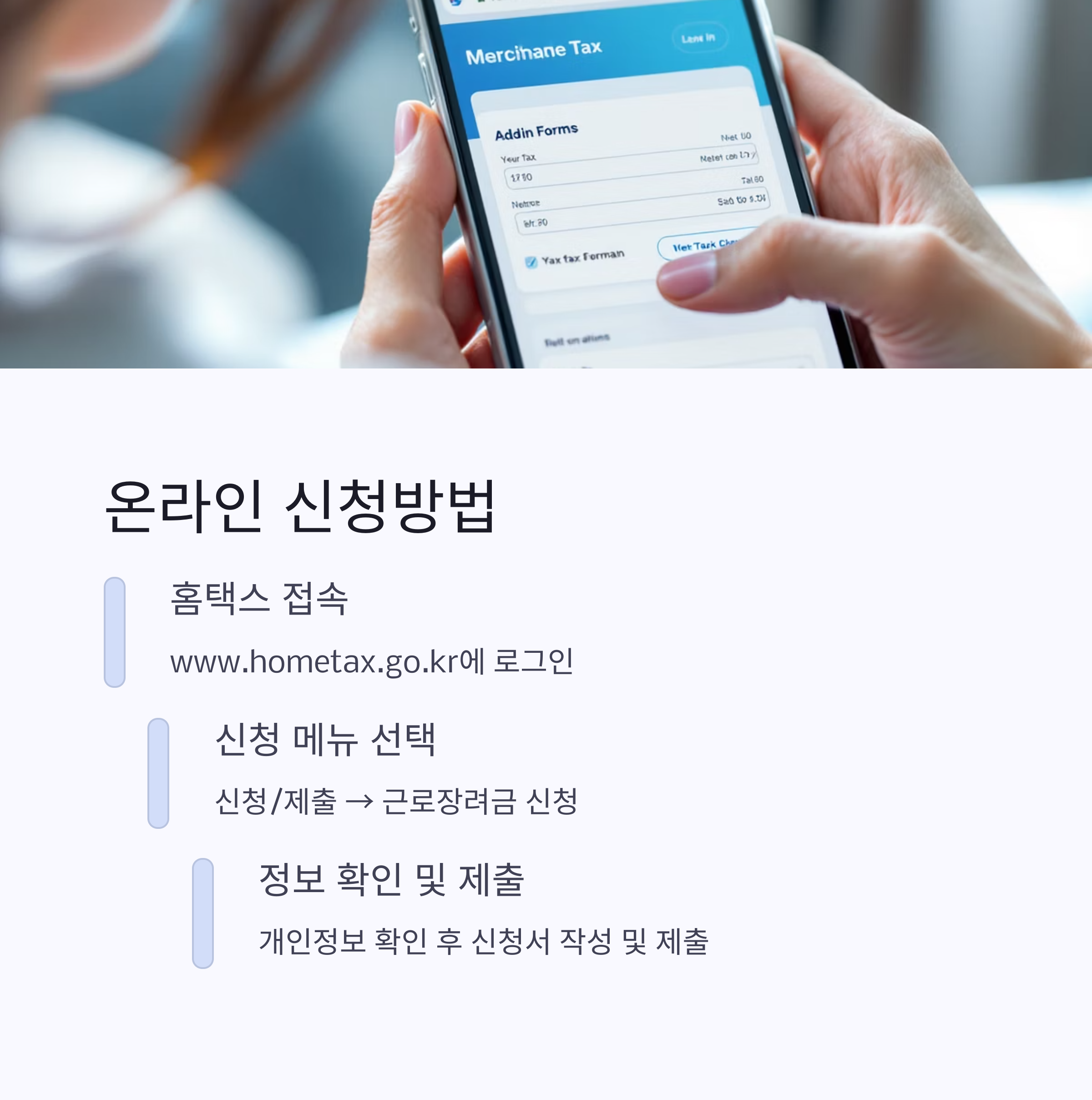 - 그 외에도 세무서 방문이나 대리인 신청(평일 9시~18시, 토·일·공휴일 제외)을 통해서도 근로장려금을 신청할 수 있습니다.