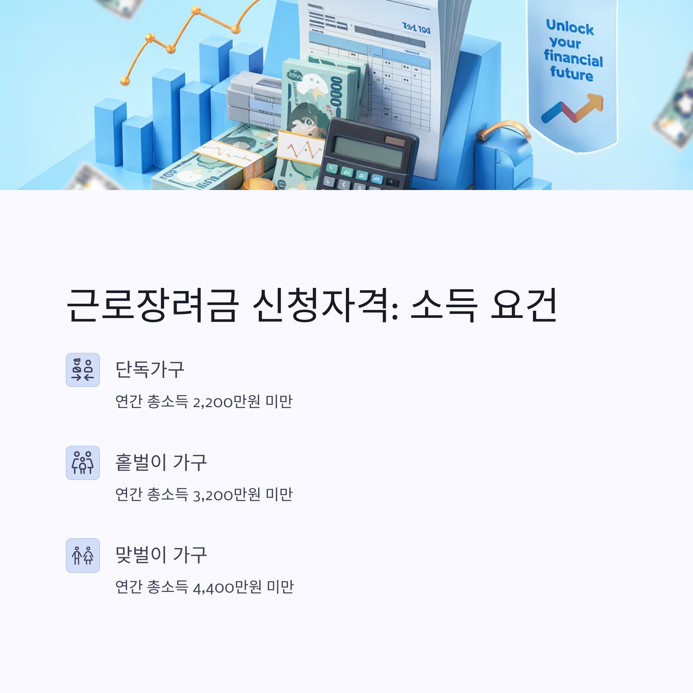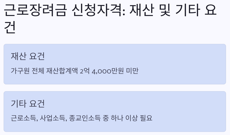 근로장려금을 받기 위해서는 소득요건, 재산요건, 그리고 기타 요건을 모두 충족해야 합니다. 각 요건에 대해 자세히 알아보겠습니다.