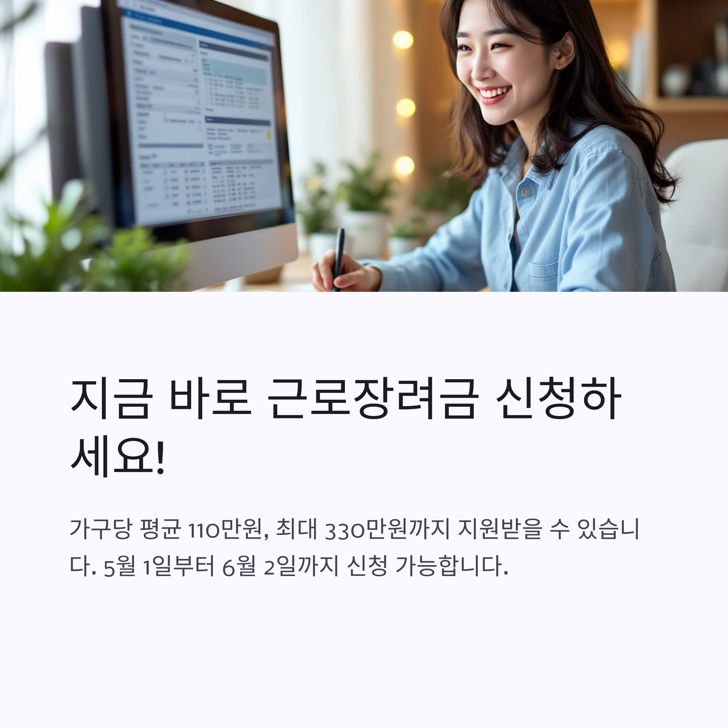 - 신청은 5월 1일부터 6월 2일까지 다양한 방법(모바일, 홈택스, ARS 등)으로 가능하며, 최대 330만 원까지 지원받을 수 있습니다.