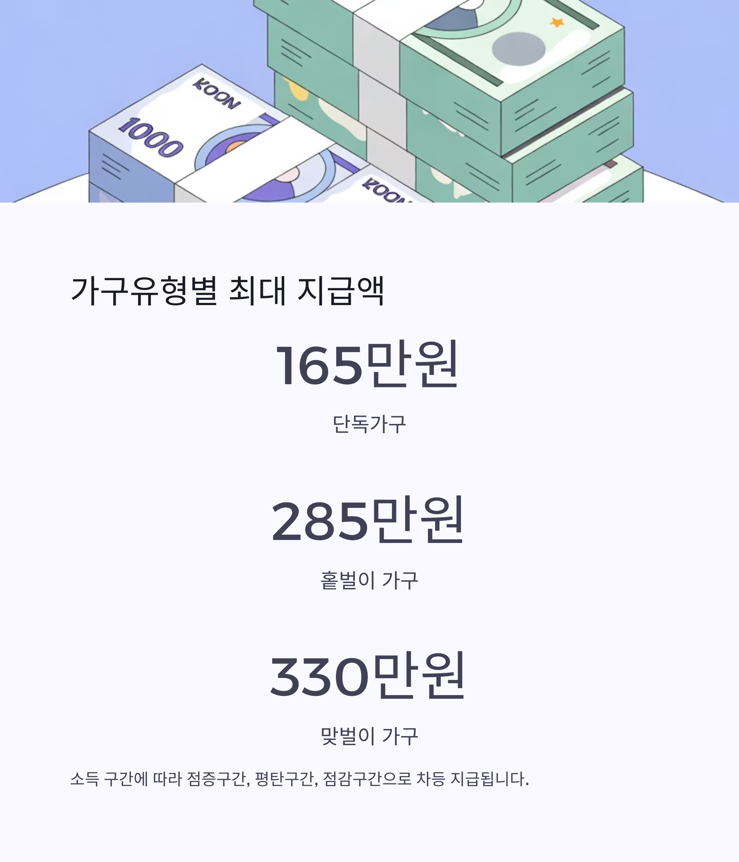 - 반면, 단독가구는 소득이 400만 원을 넘어야 최대 지급액(165만 원)에 도달할 수 있습니다.
