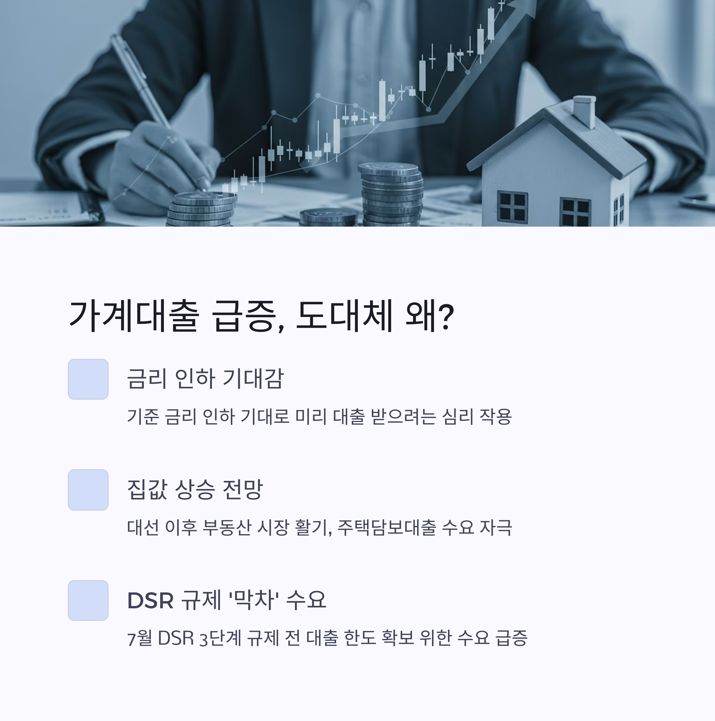 - 복합적 원인 인지: 금리 인하 기대, 집값 상승 전망, DSR 규제 임박, 주식·가상자산 투자 열풍 등 다양한 요인이 얽혀있습니다.