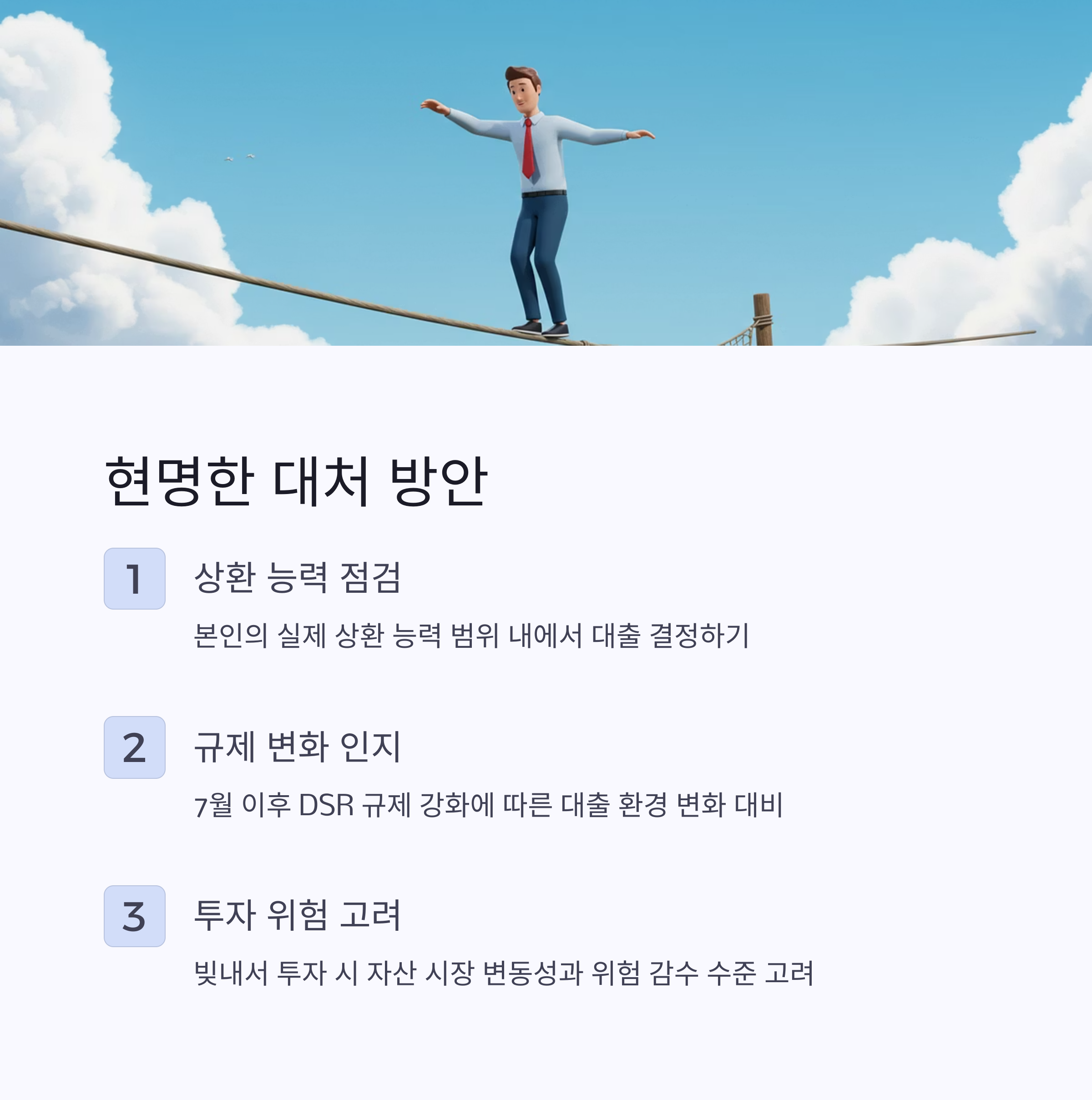 무리한 '영끌'이나 '빚투'는 예기치 못한 금리 인상이나 자산 시장의 변동성으로 인해 큰 손실로 이어질 수 있습니다. 특히 7월부터 강화되는 DSR 규제를 고려하지 않은 무계획적인 대출은 장기적으로 재정적 어려움을 초래할 수 있으니 신중해야 합니다.