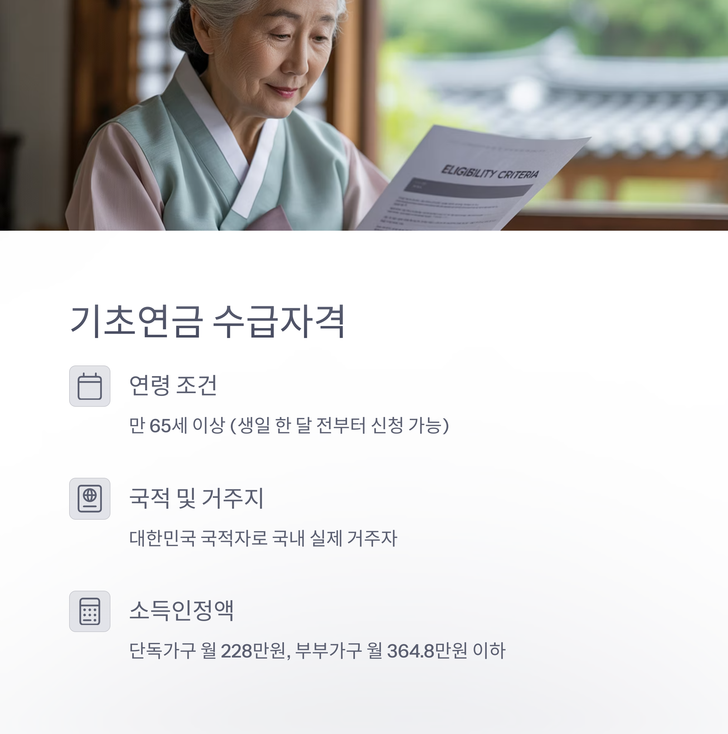 기초연금을 받기 위해서는 크게 연령, 국적 및 거주지, 소득 및 재산 기준을 모두 충족해야 합니다. 2025년 기준으로 정확히 어떤 조건들을 갖추어야 하는지 자세히 살펴보겠습니다.