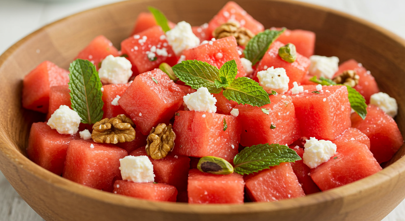 - 수박을 깍둑썰기하고, 짭조름한 페타 치즈, 신선한 민트 잎, 그리고 고소한 견과류를 함께 섞어보세요.