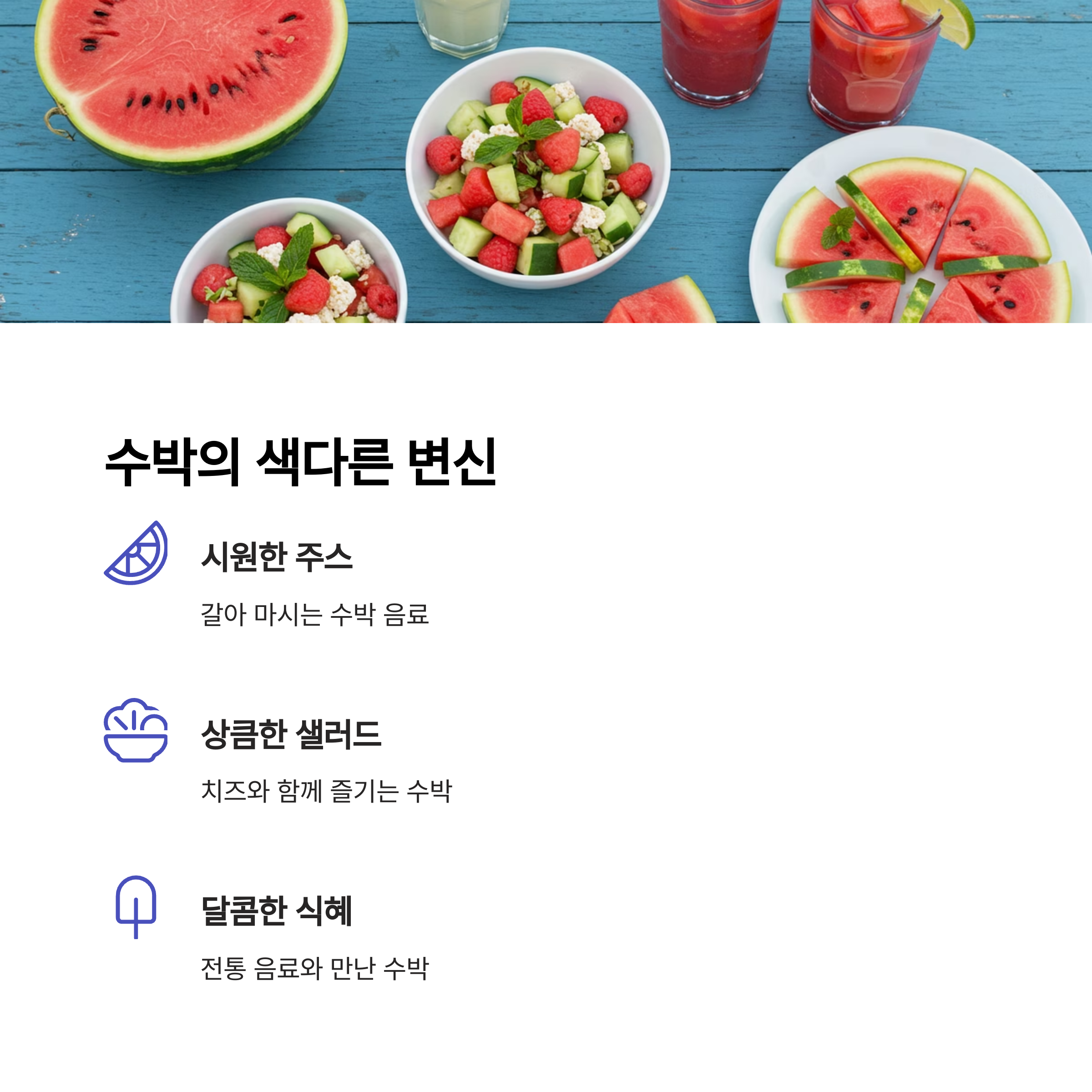 - 다채로운 레시피: 그냥 먹는 것 외에도 주스, 샐러드, 식혜, 다양한 디저트 등으로 수박을 더욱 맛있게 즐길 수 있어요.