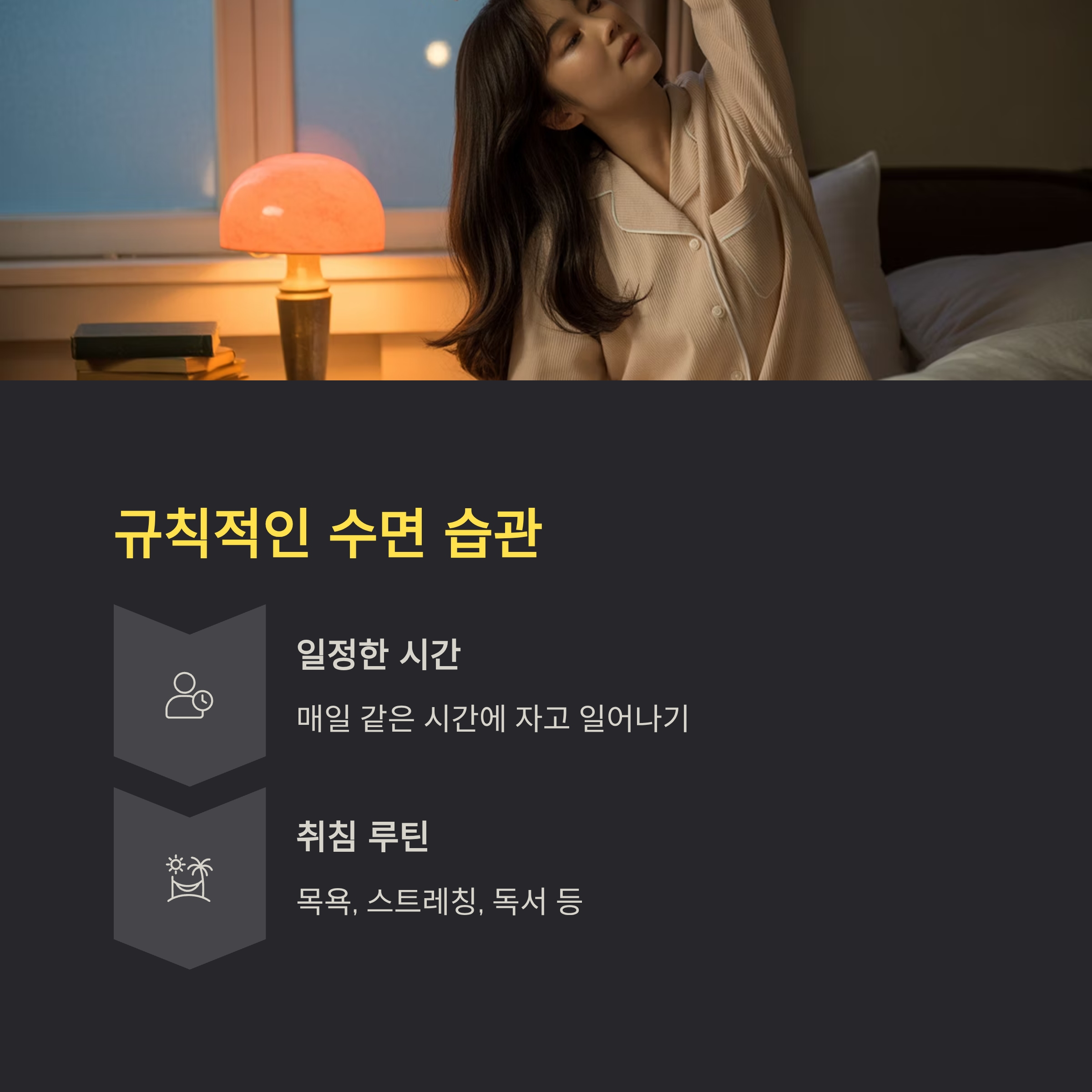 • 취침 전 루틴(목욕, 가벼운 스트레칭, 독서 등) 만들기