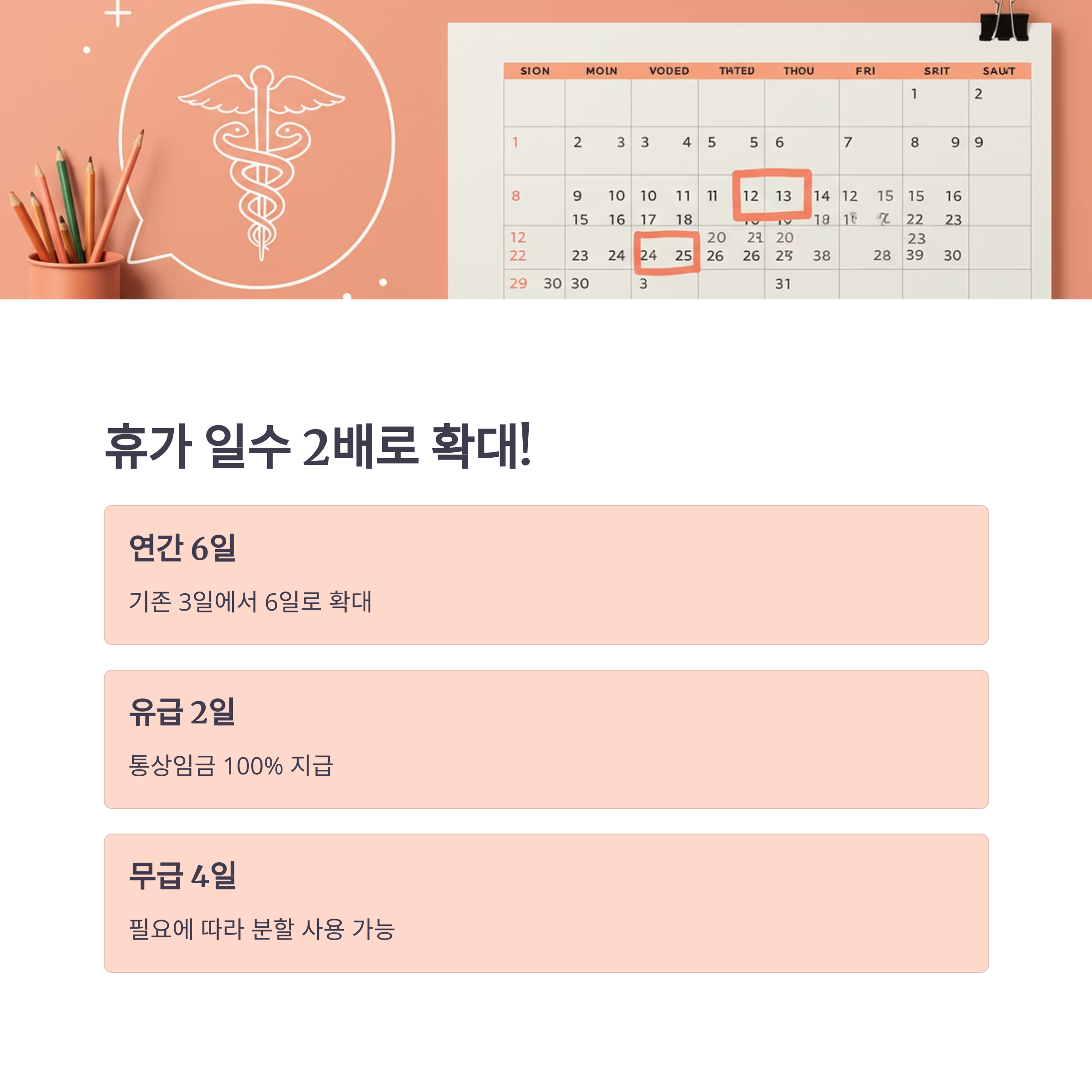 - 휴가 일수 2배 확대: 기존 3일에서 연간 6일로 늘어나 치료에 필요한 시간적 여유가 생깁니다.