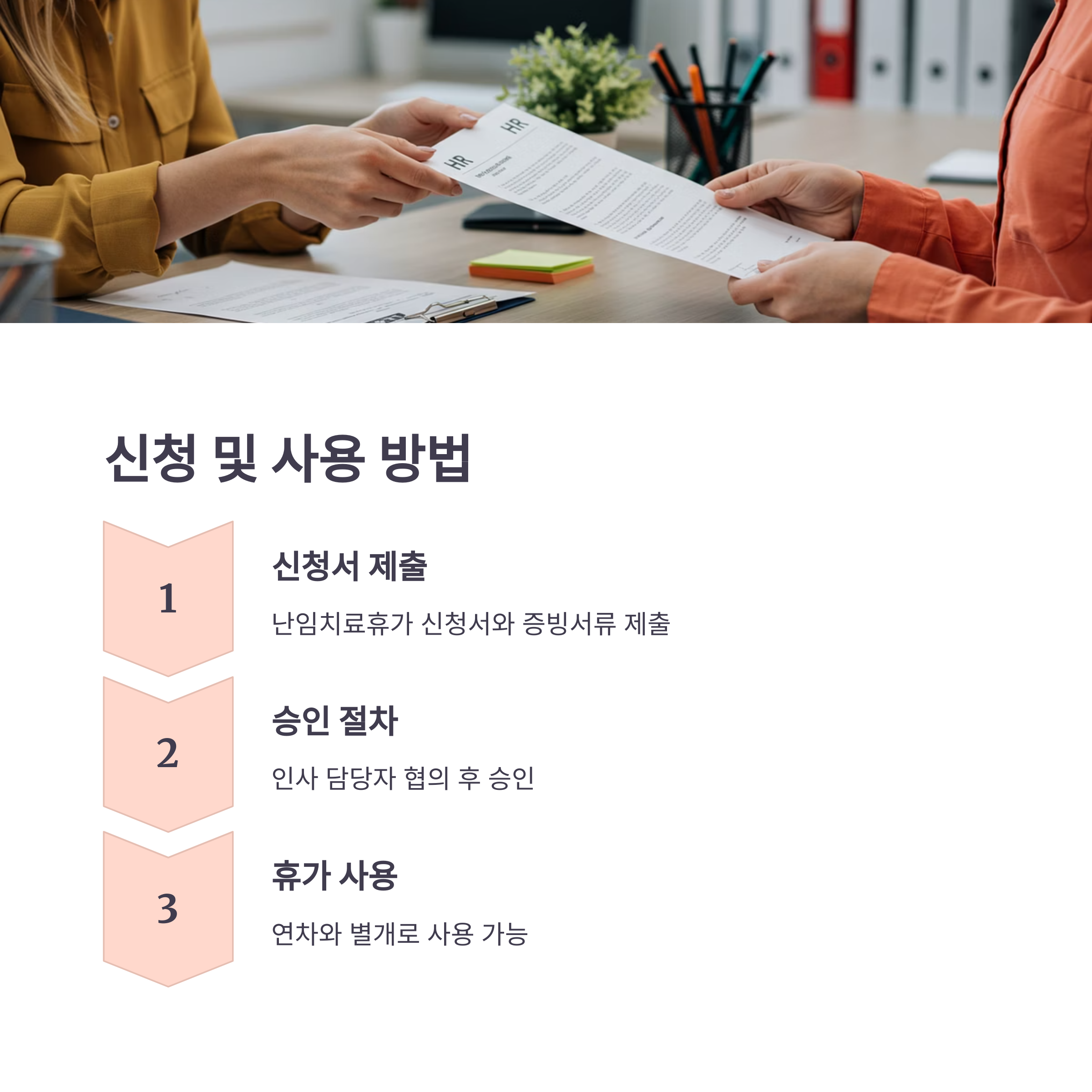 - 신청 방법: 회사에 난임치료휴가 신청서와 함께 위에서 언급한 난임 진단서 등 증빙 서류를 제출하면 됩니다.
