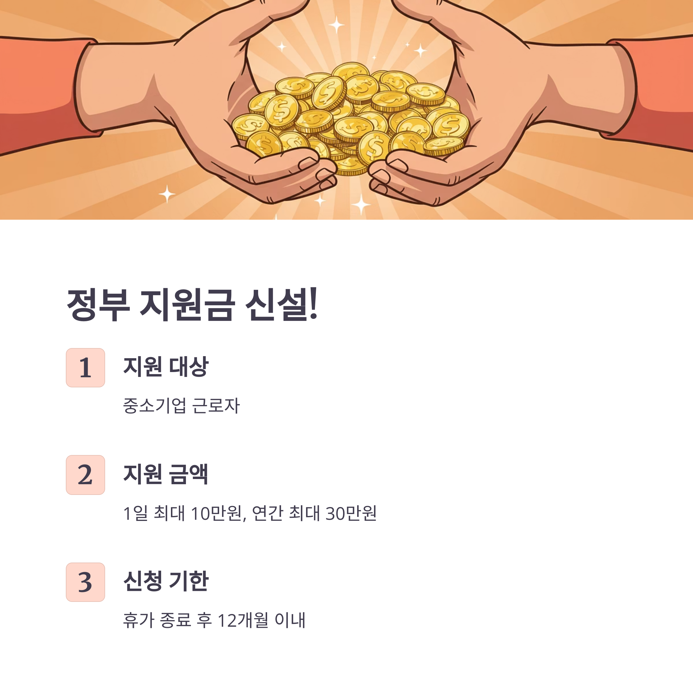 - 정부 지원금 신설: 중소기업 근로자에게는 1일 최대 10만원, 연간 30만원 한도 내에서 유급 휴가 비용을 지원합니다.