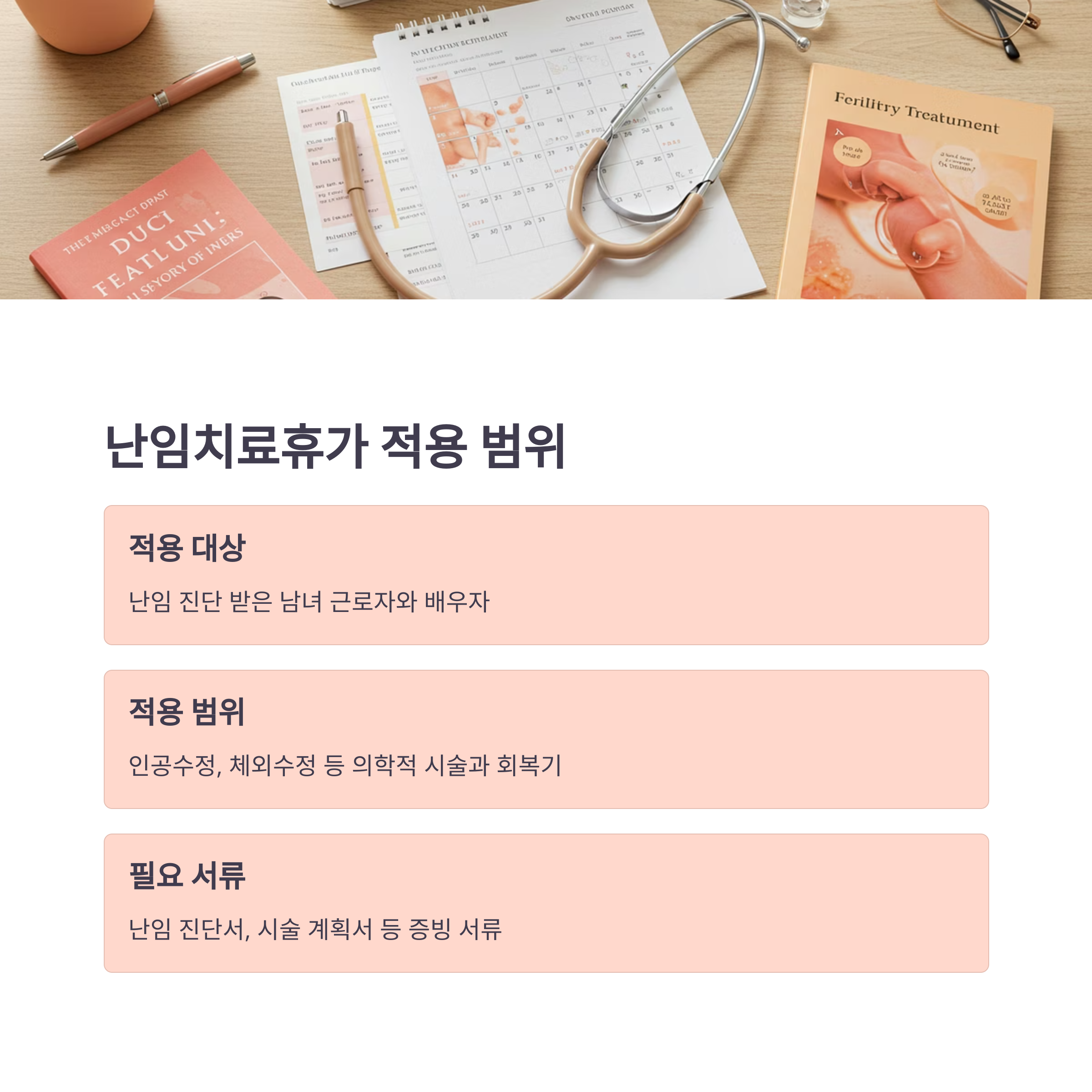 - 적용 대상: 난임 진단을 받은 남녀 근로자 (정규직, 계약직 모두 가능)이며, 배우자도 신청할 수 있어요.
