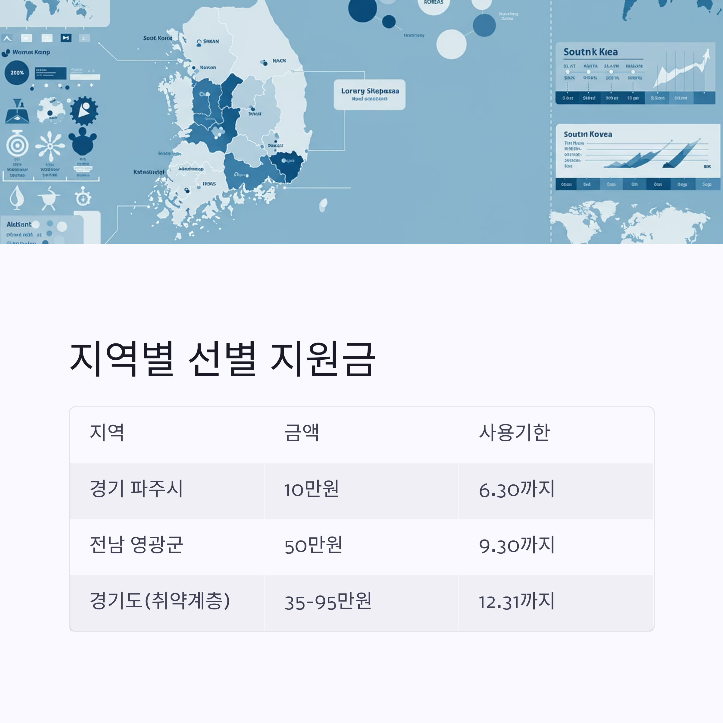 전국민 지급 외에도 각 지자체별선별적으로 지급하는 지원금도 있습니다. 이 부분은 지역마다 세부 자격지급 금액이 다르니, 반드시 본인이 거주하는 지역의 기준을 확인하셔야 해요. 2025년 상반기 기준 주요 지역별 현황을 표로 정리해봤습니다.