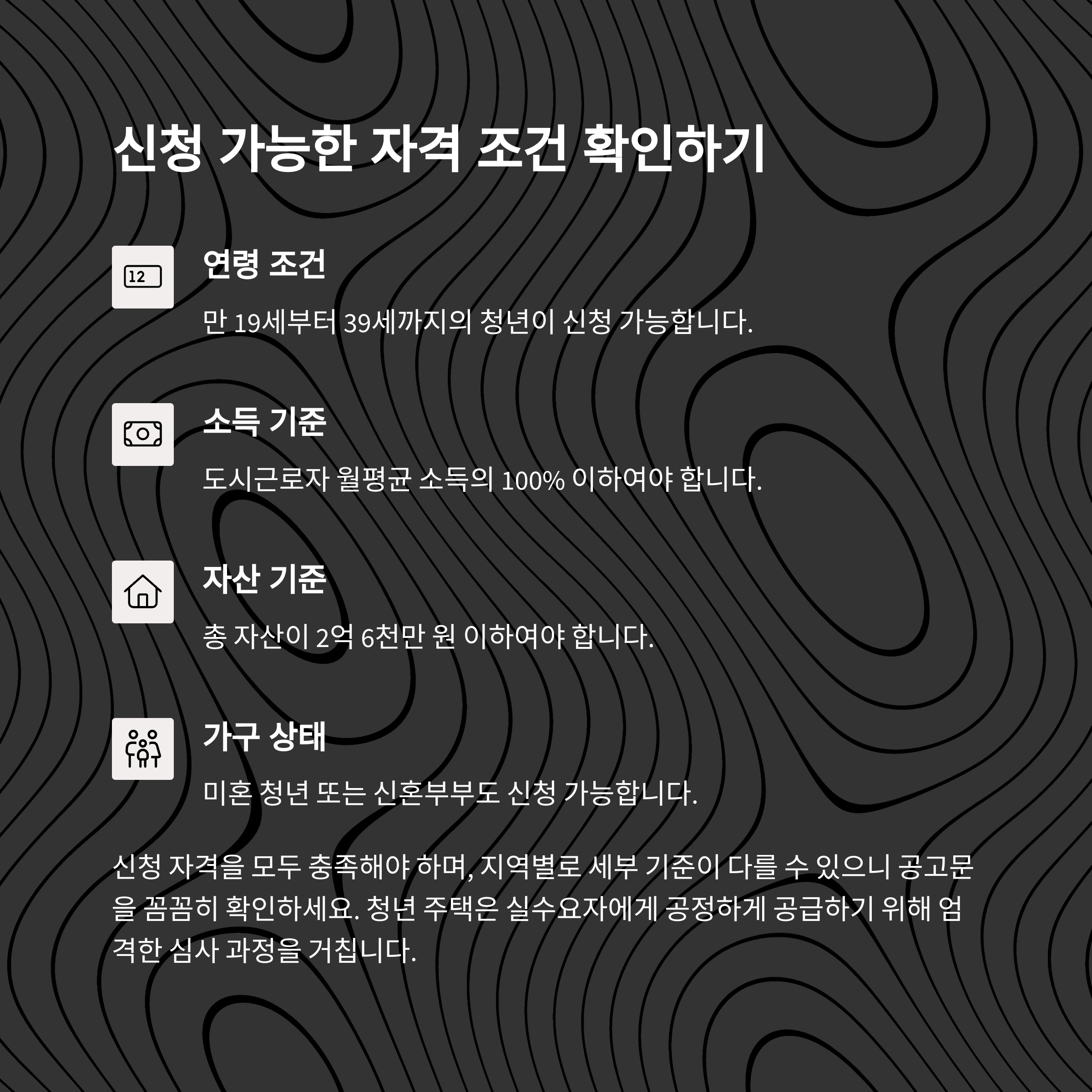 청년 맞춤형 공공임대주택 신청을 위해서는 일정한 자격 조건을 충족해야 합니다. 2025년 기준 주요 지원 자격은 다음과 같습니다.