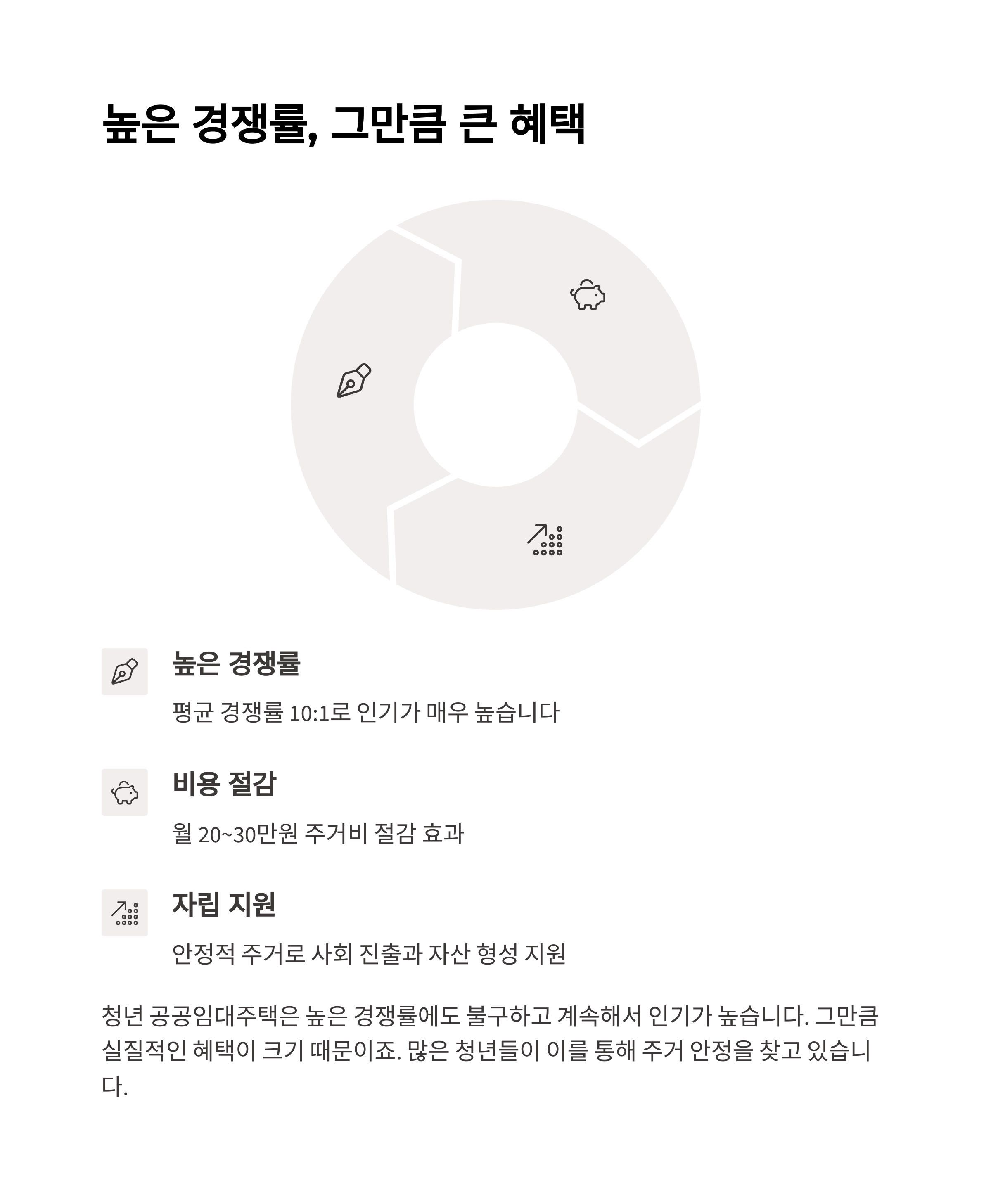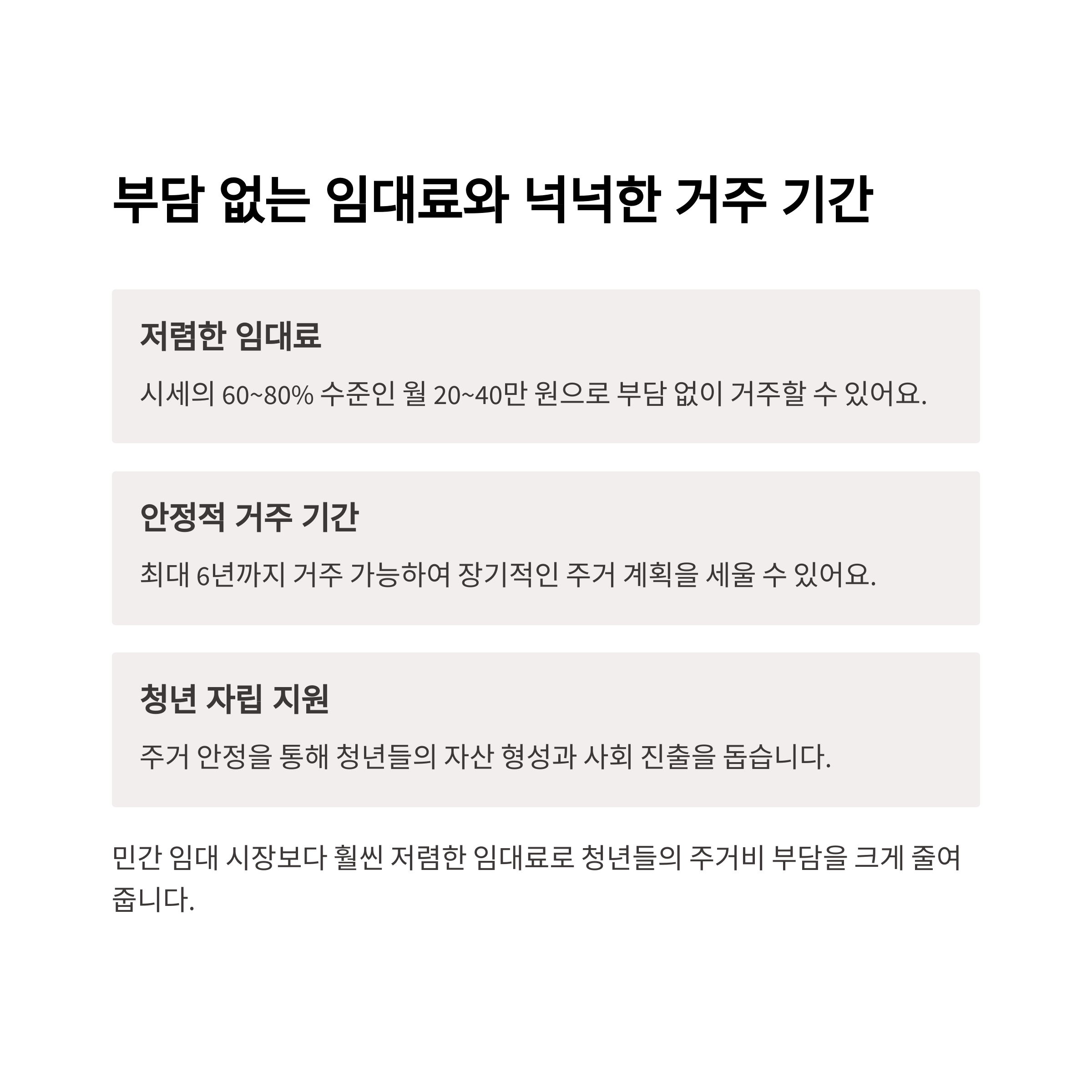 - 주거비 절감: 시세 대비 20~40% 저렴한 임대료로 청년층의 주거비 부담 완화