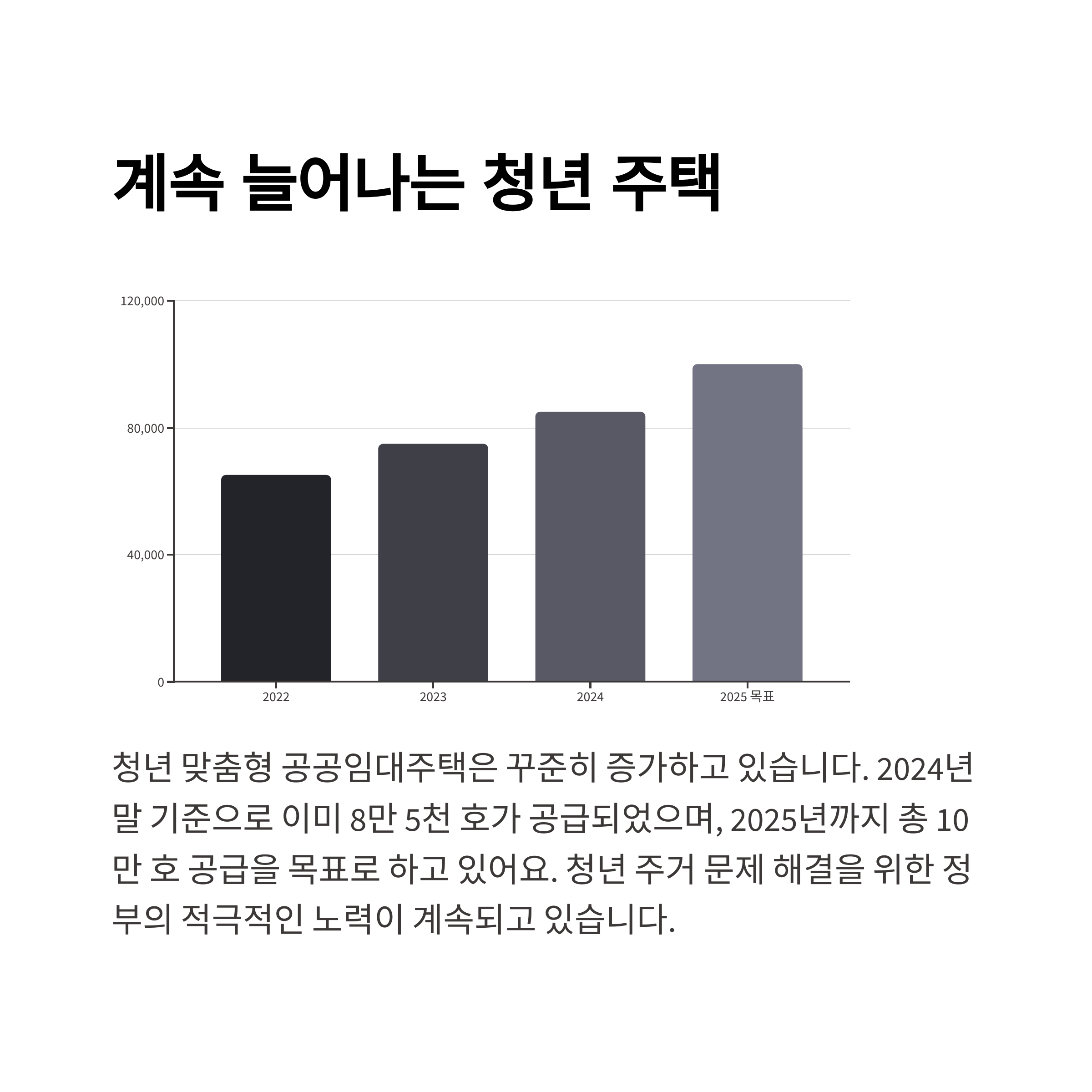 | 공급 확대 | 역세권 청년주택, 청년 매입임대주택 등 다양한 유형 확대 | 선택의 폭 증가 |