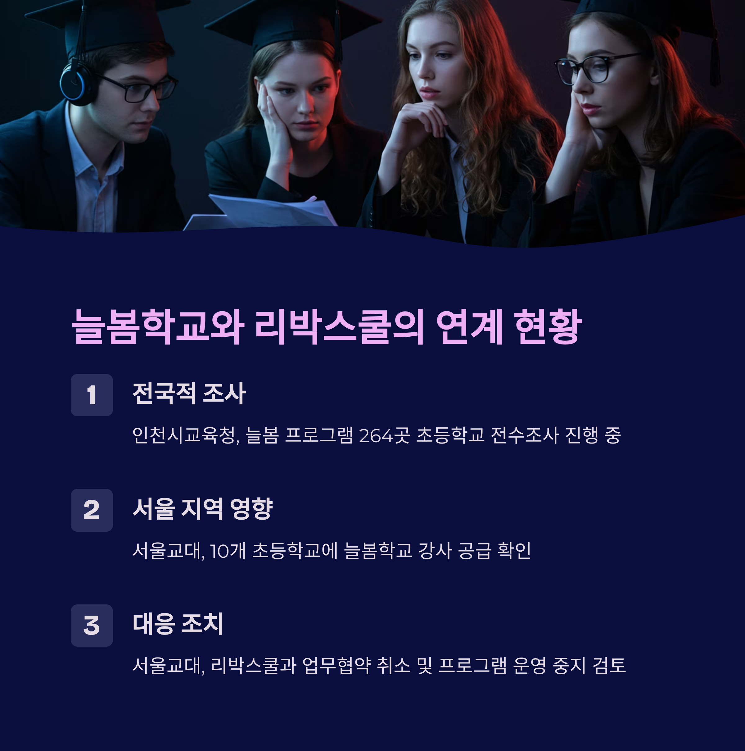 - 교육부도 전국 17개 시·도 교육청을 대상으로 리박스쿨과 늘봄학교 간 연관성에 대해 전수조사를 실시하고 있고, 문제가 확인되면 현장 점검과 조치를 취할 방침이라고 하네요.