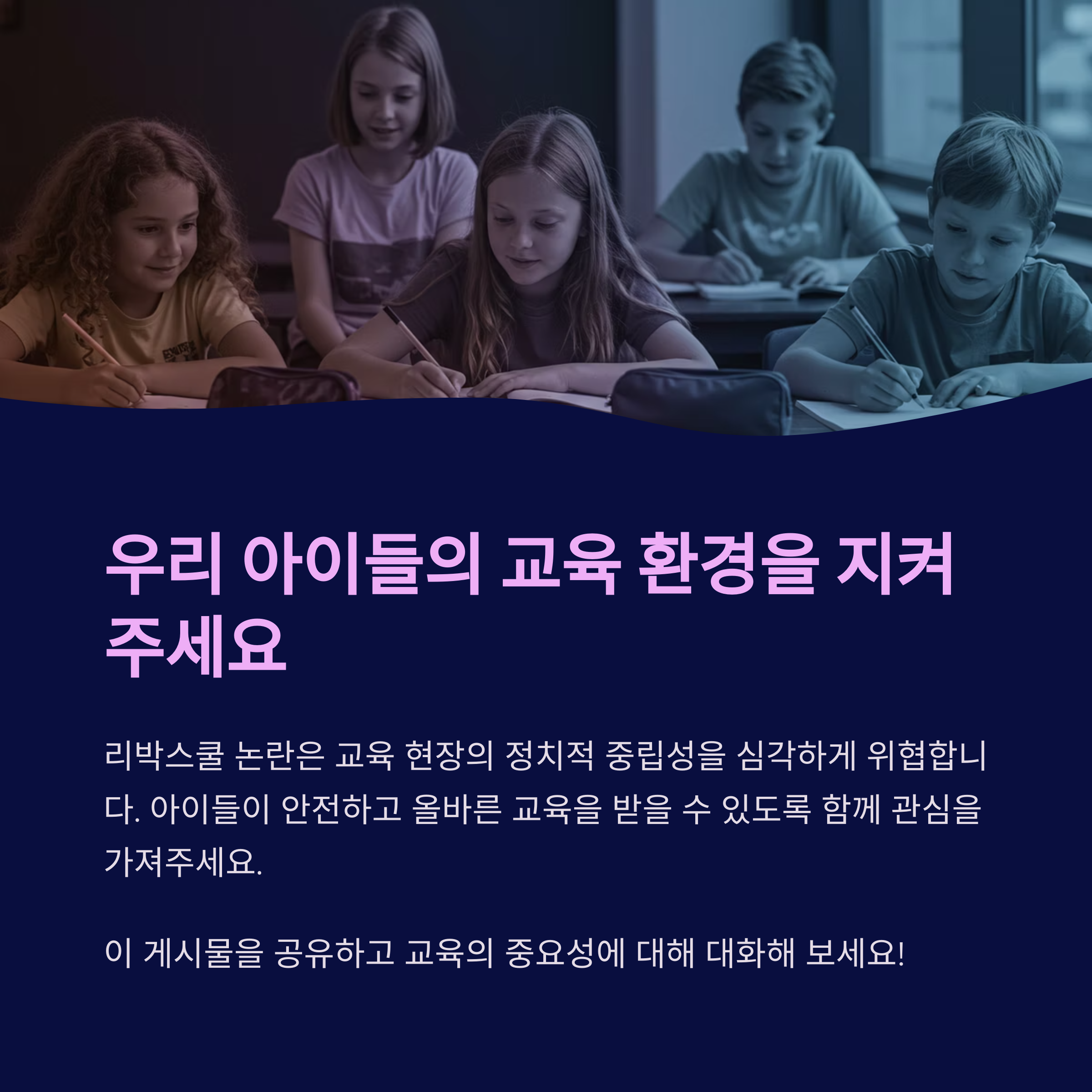 - 만약 문제가 확인되면 국민에게 설명과 사과를 요구하고 있는 상황입니다. 우리 아이들이 정치적 선동에 노출되지 않도록 교육 현장은 정말이지 청정해야 하잖아요?