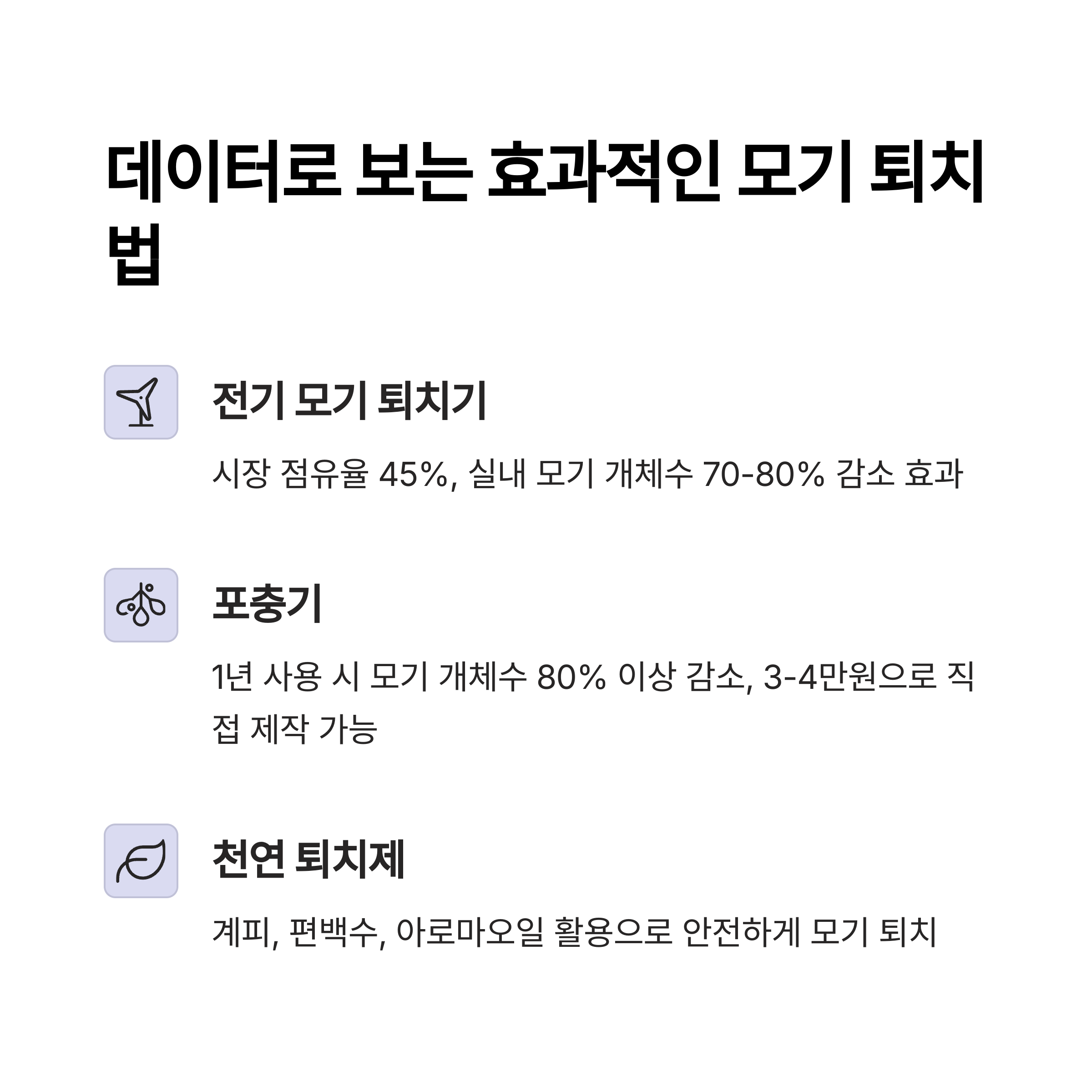 | 전기 모기 퇴치기 | 시장점유율 45%, 2만~10만 원, 개체수 70~80% 감소 |
