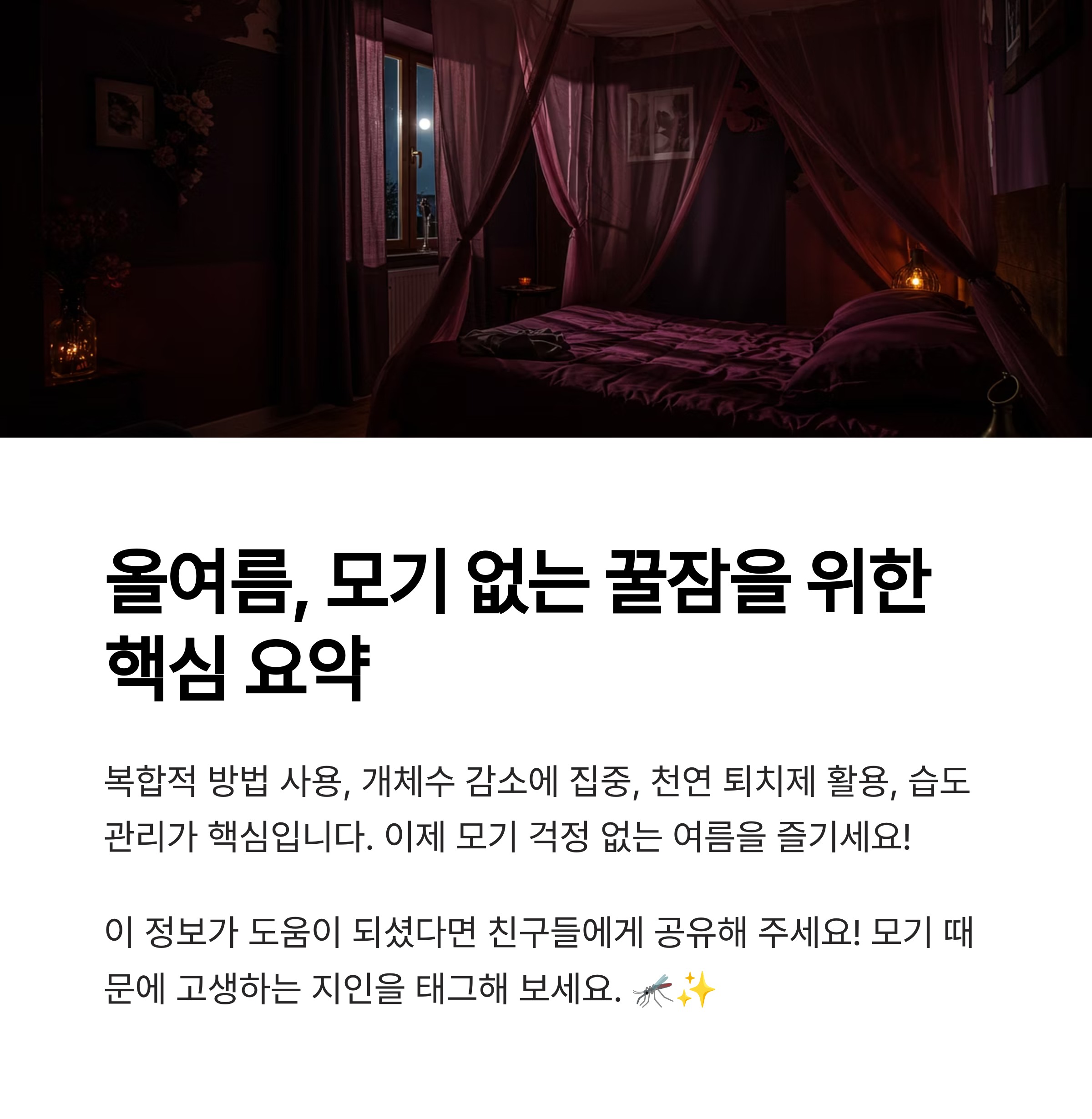 - 이제 모기 때문에 잠 못 이루는 밤은 그만! 이 가이드가 여러분의 쾌적한 여름을 책임지는 데 도움이 되기를 바랍니다.