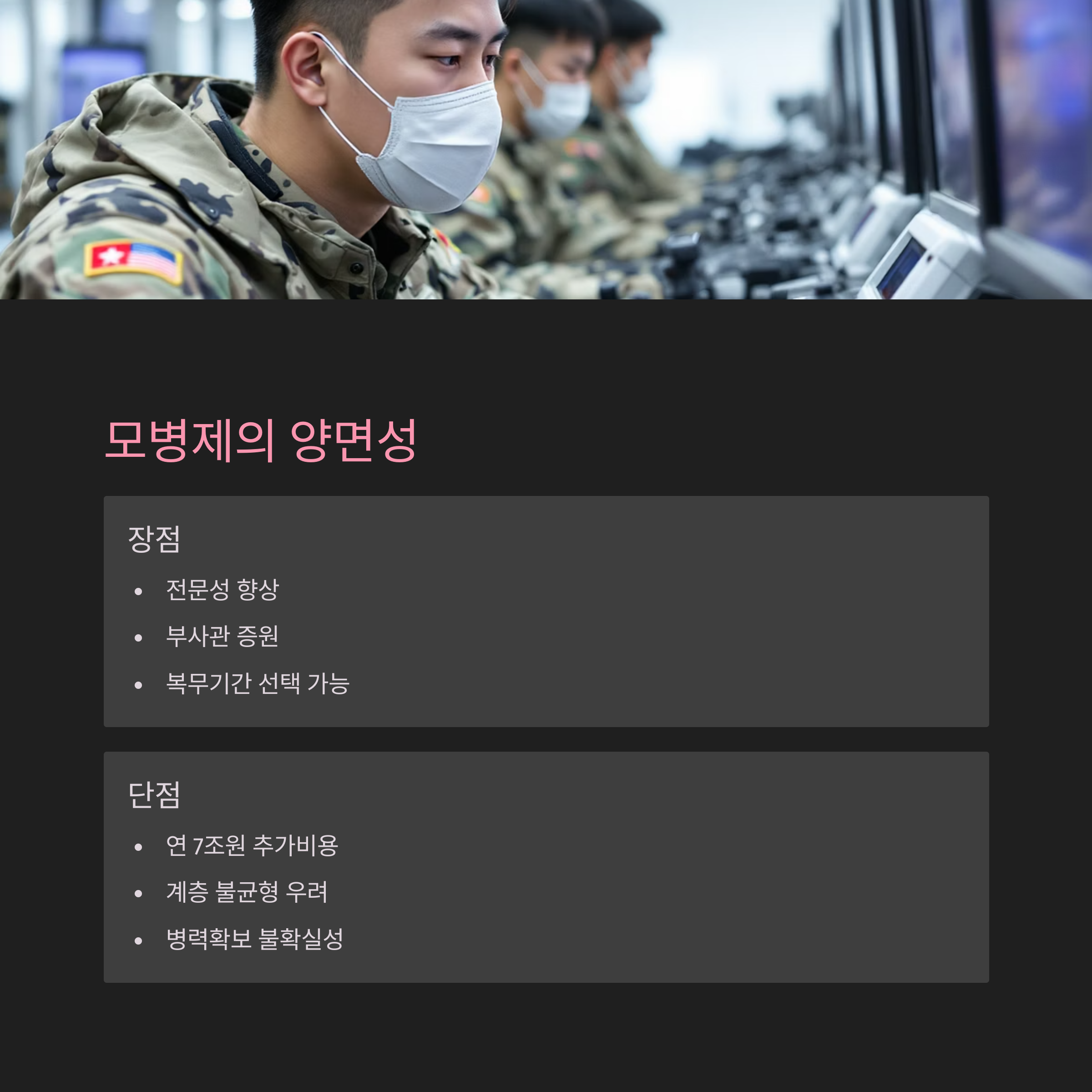 - 주거·복지 비용: 직업군인 확대 시 주택·교육·의료 등 지원 필요