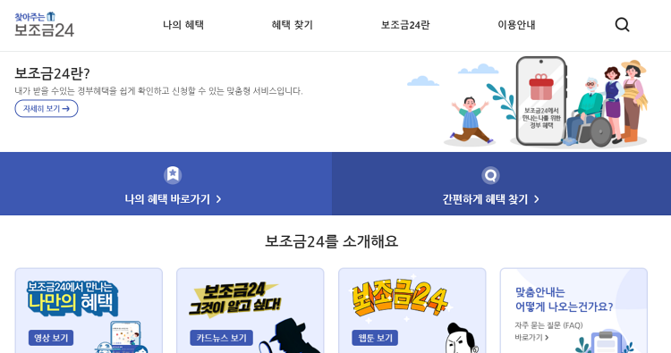 그러니까 한마디로 요약하자면 정부에서 다양하게 제공되는 각종 보조금 혜택들을 보조금 24라는 페이지에 모아놨기 때문에 로그인만 하면 내가 받을 수 있는 서비스가 무엇이 있는지 개인별로 다 알아볼 수 있는 거죠.