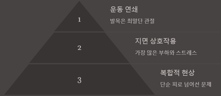 발목 통증은 단순한 근육 피로나 일시적 손상을 넘어서는 복합적인 현상입니다. 인체의 운동 연쇄(Kinetic Chain) 관점에서 볼 때, 발목은 지면과 직접 상호작용하는 최말단 관절로서 가장 많은 부하와 스트레스를 받는 부위입니다.