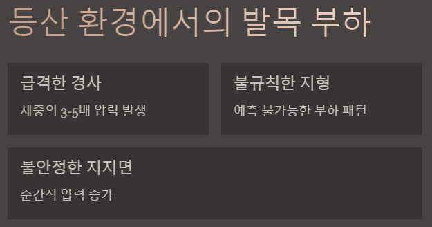 등산로의 특성은 평지와 완전히 다른 생체역학적 요구사항을 만들어냅니다. 급격한 경사, 불규칙한 지형, 불안정한 지지면은 우리 발목에 평균 체중의 3-5배에 달하는 압력을 순간적으로 가합니다.