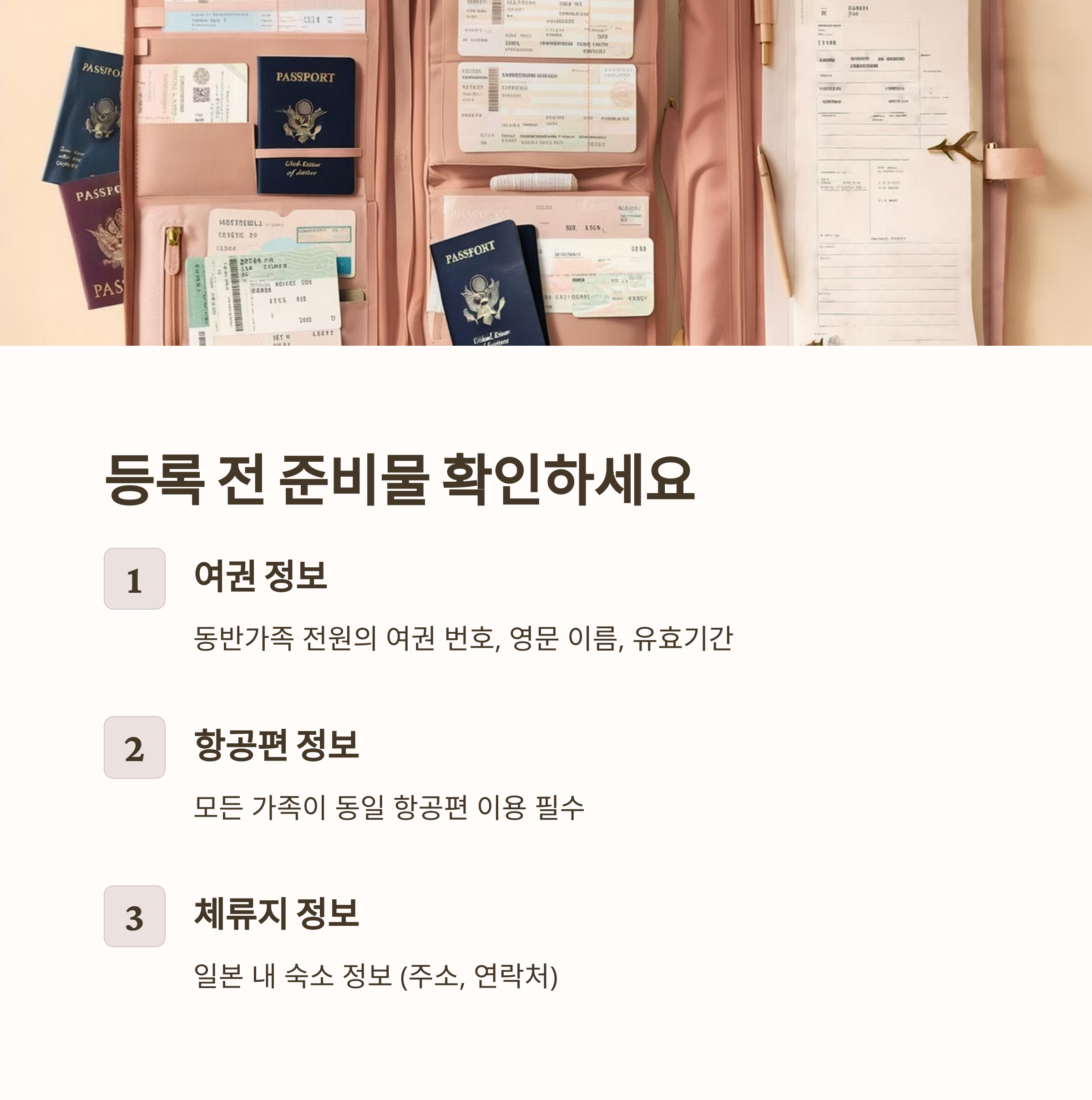 - 항공편 정보: 모든 가족이 동일 항공편 이용 필수 (2025년 규정)