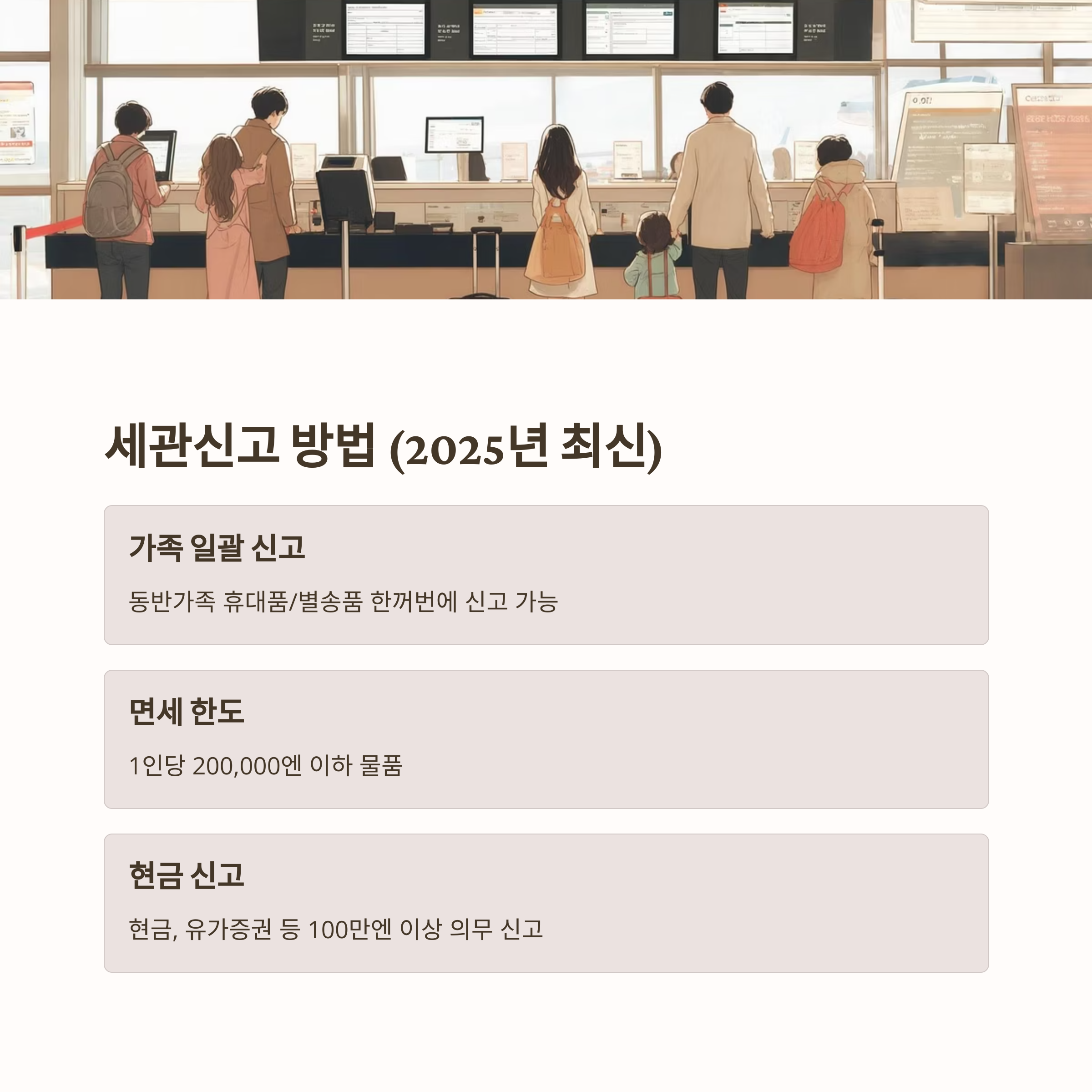 | 현금 신고 | 현금, 유가증권 등 합계 100만엔 이상 소지 시 의무 신고 |
