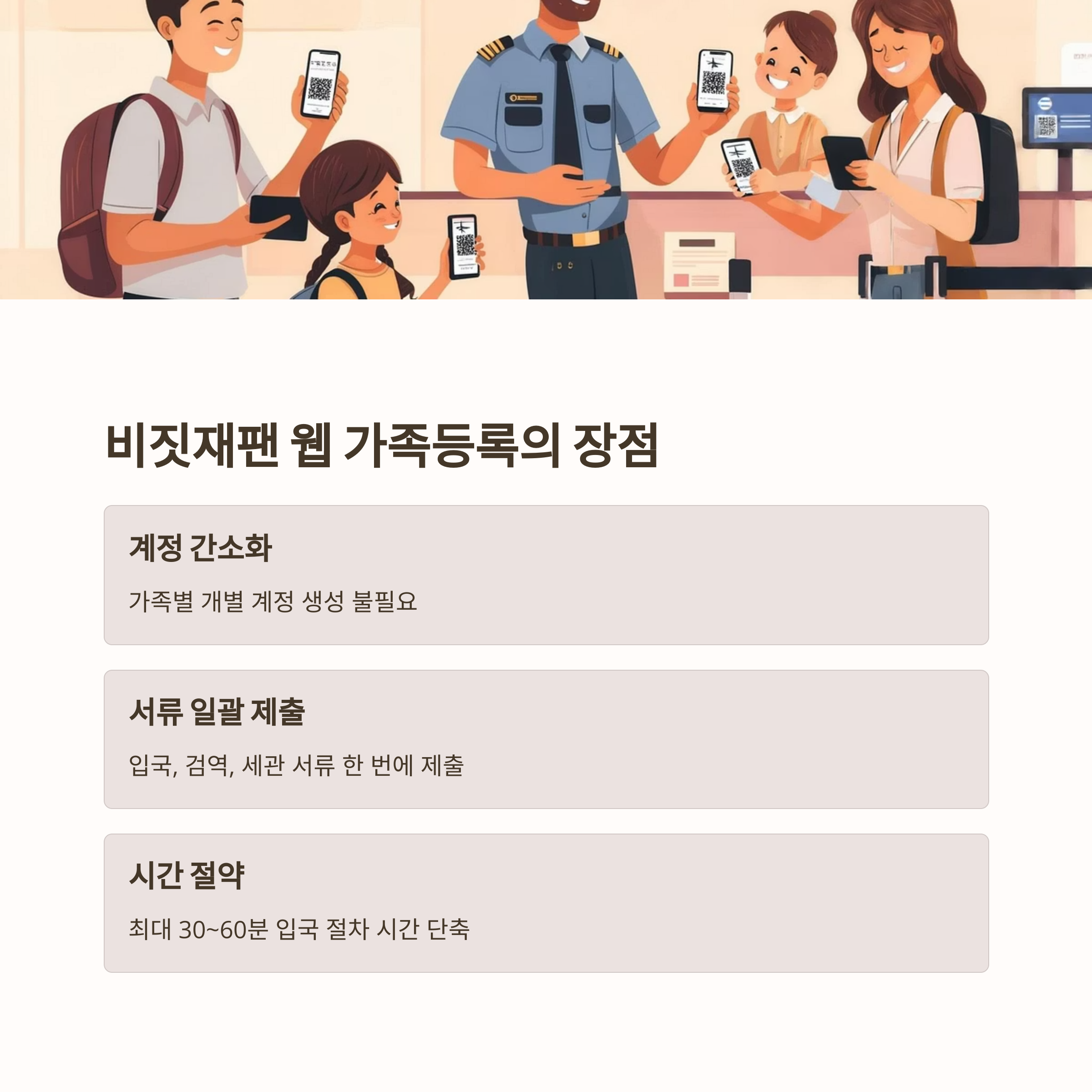 - 가족여행 계획 시 출발 최소 72시간 전에는 비짓재팬 웹에 모든 정보를 등록하고, QR코드를 발급받아 스마트폰에 저장해 두시기 바랍니다.