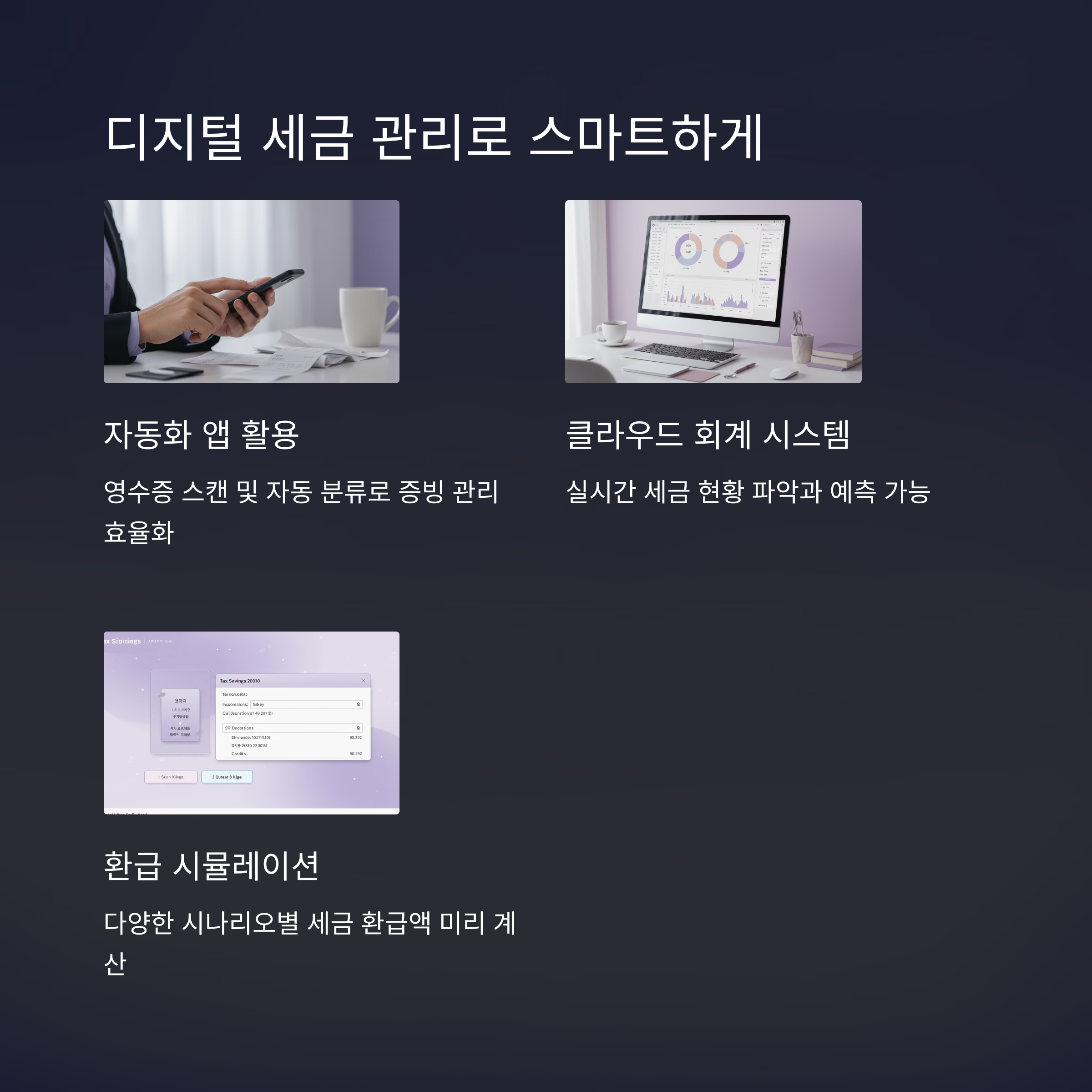 - 세금 계산 프로그램: 복잡한 세금 계산을 자동화하고 최적의 공제 방법을 제안합니다.
