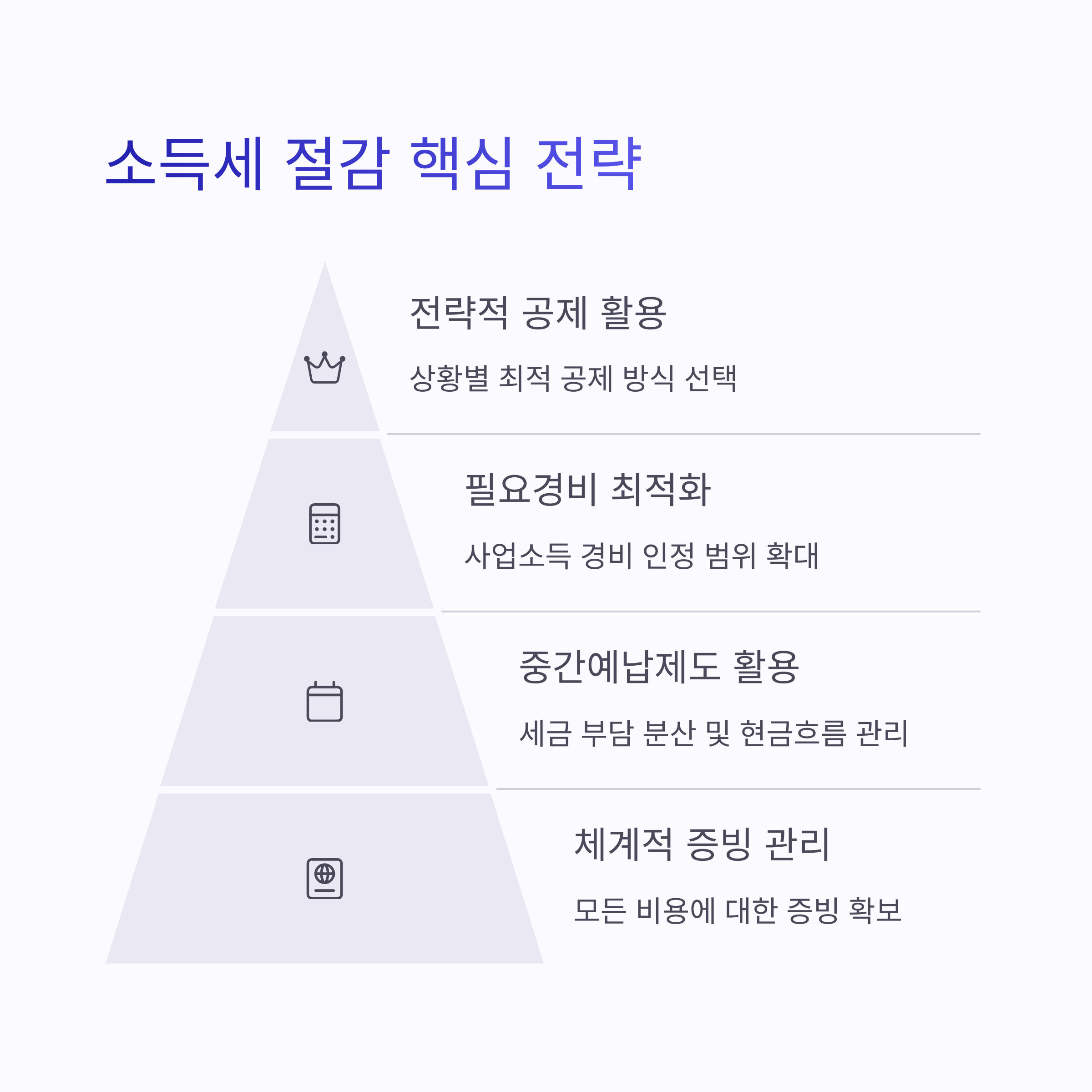 - 사업 구조 최적화: 개인사업자, 법인 등 세금 효율이 높은 사업 구조를 선택합니다.