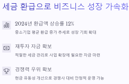 효율적인 세금 환급 관리는 기업의 현금 흐름을 개선할 뿐만 아니라, 장기적인 재무 계획 수립에도 중요한 역할을 합니다. 세금 최적화를 통해 확보된 자금은 사업 확장, 신규 투자, 또는 비상 자금으로 활용될 수 있어 기업의 성장과 안정성에 기여합니다.