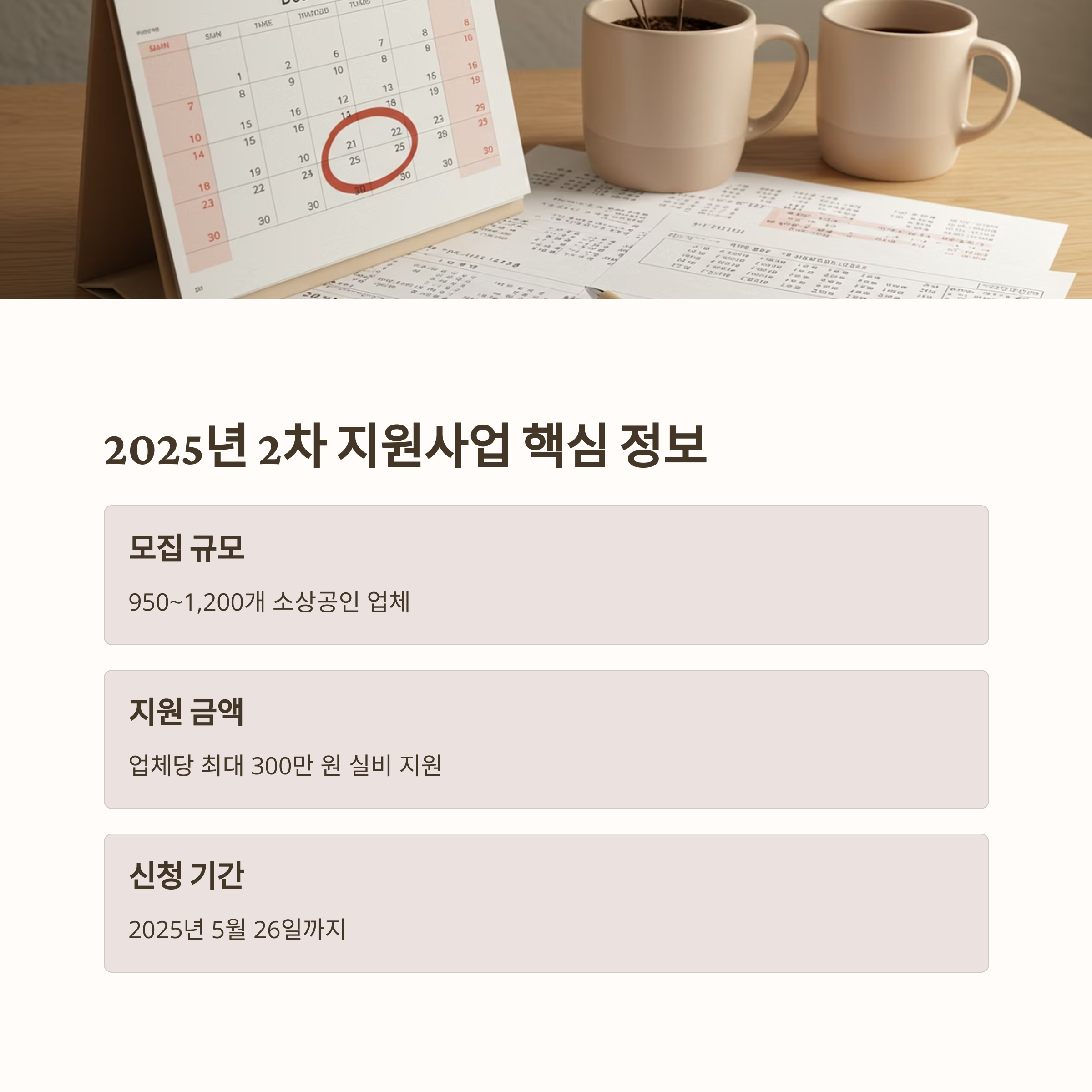 - 신청 기간: 2025년 5월 26일 (2차 공고 기준). 1차는 3월에 이미 진행되었어요! 서둘러야 할 시점이죠? (소상공인 지원 신청)
