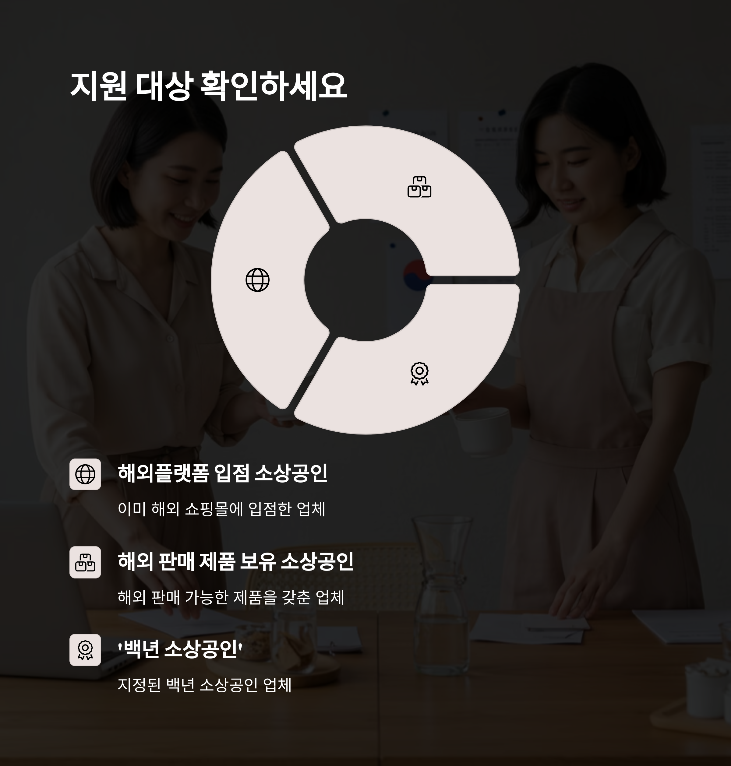 | 지원 대상 | 해외 플랫폼 입점 경험/제품 보유 소상공인, 백년 소상공인 (해외 이커머스 지원) |