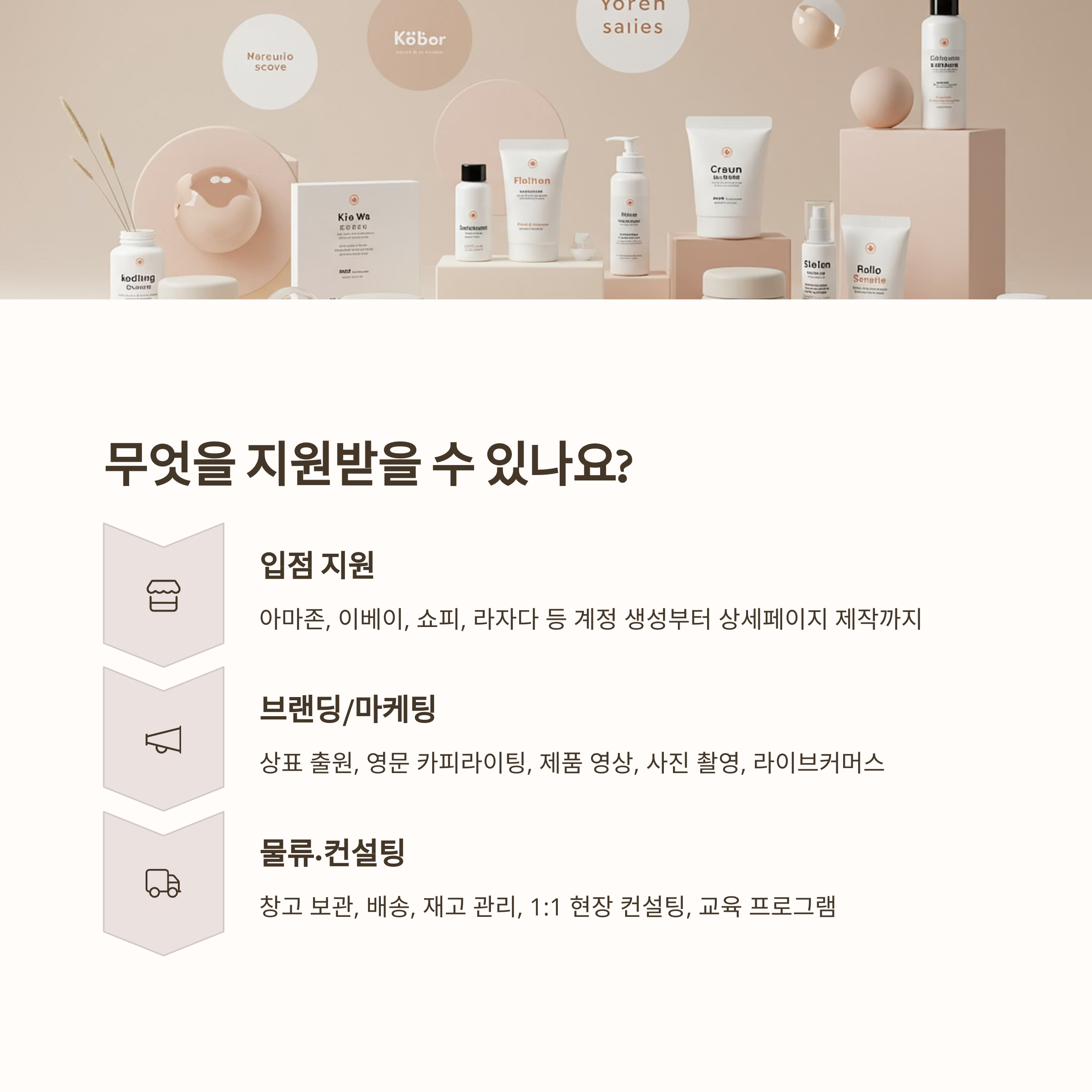 - 입점 지원: 미국 아마존, 이베이, 동남아 쇼피·라자다·틱톡샵 등 해외 주요 플랫폼 입점을 도와줍니다. 계정 생성부터 상품 상세페이지 번역·디자인, 리스팅, 상점 세팅까지! (아마존 입점, 쇼피 입점, 라자다 입점)